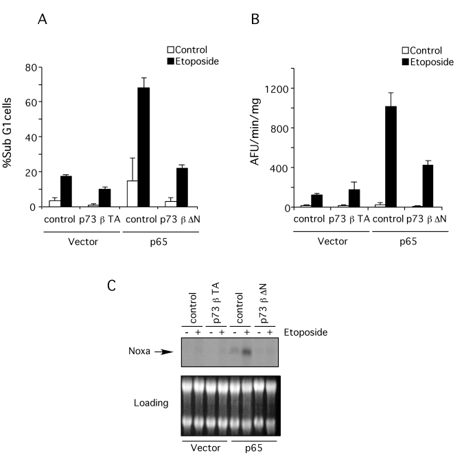 Figure 7. Dominant negative p73β blocks apoptosis induction and Noxa expression. p73β wild type was introduced into p65 null cells and p73β dominant negative was introduced into p65 reconstituted cells by retroviral transfer. Then apoptosis induction and Noxa expression was assessed after treatment with 10 μM etoposide for 18 hr. (A) Floating and attached cells were then collected and stained with propidium iodide (PI). DNA content was analyzed by flow cytometry. Results are presented as percentage of cells with sub-G1 DNA content. The data shown represent the mean and SEM of three independent experiments. (B) S-100 extracts from p65 null (vector) and reconstituted cells (p65) were used to assess caspase activity by cleavage (arbitrary fluorescence units per minute [AFU/min]) of the fluorogenic substrate, Ac-DEVD-afc. The data shown represent the mean and SEM of three independent experiments. (C) Northern Blot for Noxa expression. Total RNA was extracted from p65 null (vector) and reconstituted (p65) cells after treatment with etoposide. Expression of Noxa was revealed by blotting with a specific radio-labeled probe. As loading control the ethidium bromide stained gel previous to transfer onto membrane is shown. This blot is representative of three independent experiments.