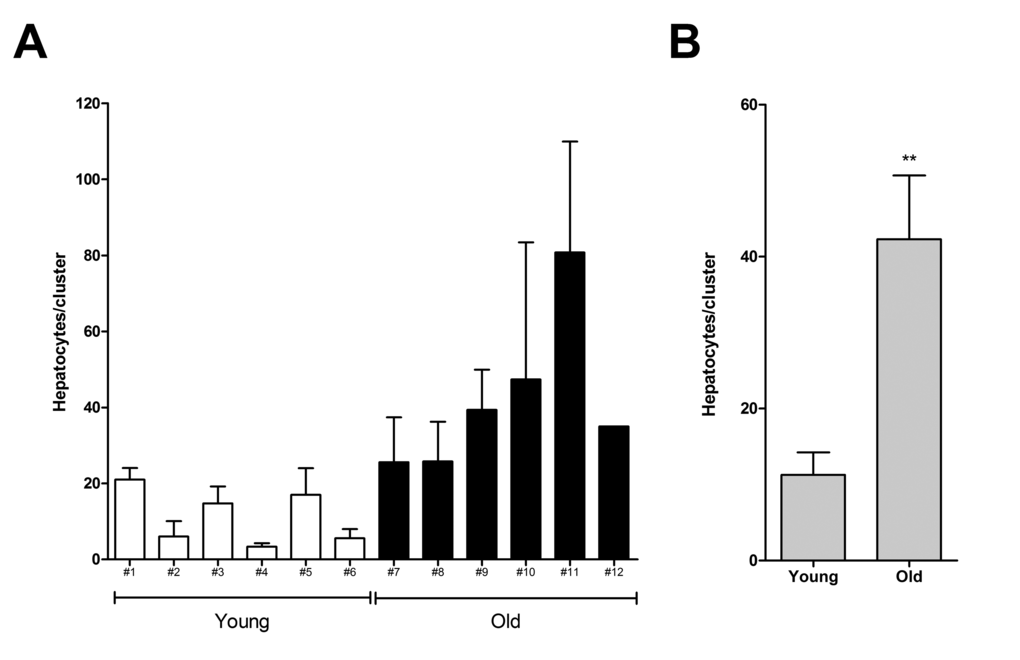 Figure 1. Size of donor-derived, pre-neoplastic hepatocyte clusters in animals transplanted at young or old age and killed 3 months after Tx (see Experimental procedures for details). Panel (A) mean cluster size (± SE) in individual animals. Panel (B) mean cluster size per group. Data are mean ± SE; **significantly different from young group:P<0.01