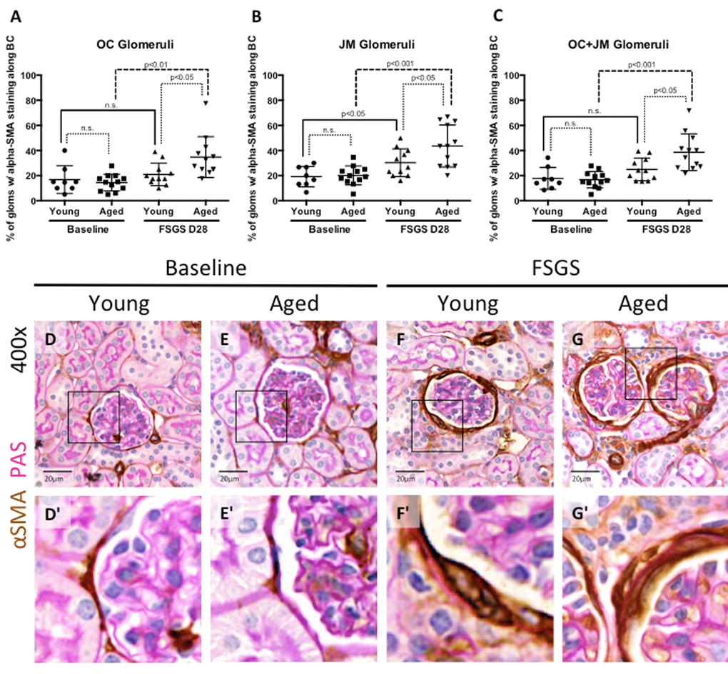 Figure 6. EMT marker staining along Bowman’s capsule was highest in aged FSGS mice. (A-C) Quantitation showing the percentage of glomeruli with α-SMA (EMT marker) staining along BC. There was no significant difference in young and aged mice at baseline in OC (A), JM (B), or combined (C) glomeruli. In OC (A), JM (B), and combined (C) glomeruli, α-SMA staining increased with disease in aged animals, while only in the JM (B) was α-SMA staining significantly increased in young mice, likely due to large variation within the sample groups. (D-G) Representative images of glomeruli with alpha-SMA staining along BC taken at 40x. Frequency and intensity α-SMA staining increased with disease (D vs. F, E vs. G), despite similar levels between young and aged animals at baseline (D vs. E). (D’-G’) Higher power images of the area demarcated by the solid square shown above, emphasizing the increase in α-SMA staining of cells along BC (F’, G’).