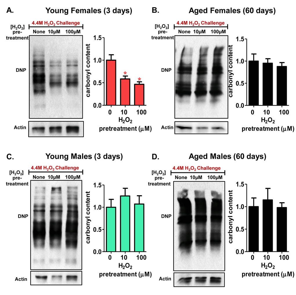 Having shown the inducibility of both protein expression and activity of the 20S proteasome, following H2O2 pretreatment of female flies (Fig. 3 and Fig. 4), it was important to determine if the adaptive increase in proteasome expression would limit damage accumulation upon subsequent exposure to a (much higher) toxic amount of H2O2 [4.4M]. Western blotting was used to examine protein carbonylation levels. Protein carbonylation is an irreversible protein modification, resulting from oxidative damage, that often leads to loss of protein function [66]. Pretreatment with a very low, adaptive dose of H2O2 [10µM or 100µM] resulted in a much lower accumulation of total protein carbonyls when 3 day old females were subjected to the toxic H2O2 dose, compared with matched controls that were not pretreated before H2O2 challenge (Fig. 10A). This was presumably because the increased proteasomal capacity of adapted animals allowed for increased rates of degradation of the oxidized, carbonyl containing, proteins generated during exposure to the toxic dose of H2O2. However, 60 day old females demonstrated no adaptive decrease in the accumulation of protein carbonyl levels after pretreatment with toxic levels of H2O2 (Fig. 10B), following a similar trend in the loss in proteasome induction with age. Similarly, pretreatment with low levels of H2O2 failed to prevent the significant accumulation of carbonylated proteins in either young or old male flies (Fig. 10C and 10D), both of whom also failed to adapt to H2O2 in any other way measured in this study. Thus, these results for cumulative protein damage (carbonyl accumulation) reflect the changes (or lack of change) in 20S proteasome expression and activity observed in pretreated flies (Fig. 3A, 3B, and Fig. 4).