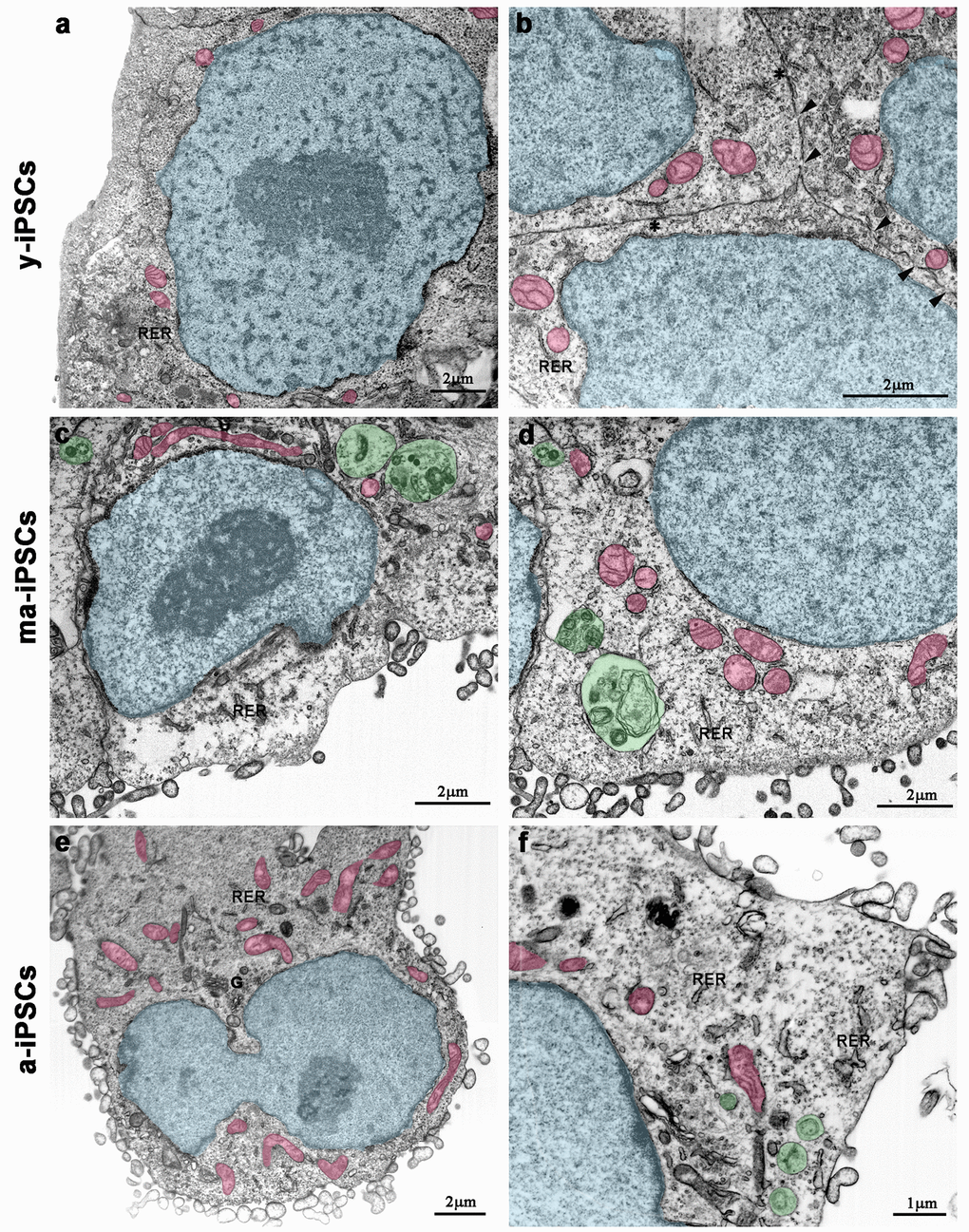 Figure 2. FIB/SEM micrographs of y-iPSCs (a,b), ma-iPSCs (c,d) and a-iPSCs (e,f). Images have been electronically colored to highlight nuclei (in blue), mitochondria (in pink), and autophagosomes (in green). Arrowheads, gap junctions; asterisks, tight junctions; G, Golgi apparatus; RER, rough endoplasmic reticulum.