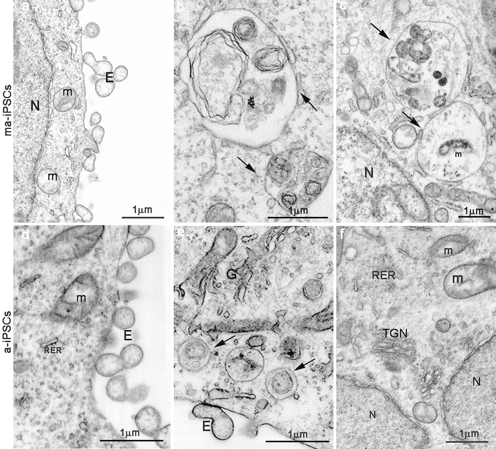 In ma- and a-iPSCs, electron microscopy shows irregularly shaped plasma membranes, close to which spheroidal vesicles are present (Figure 2c-f). These vesicles, likely corresponding to exosomes, based on their appearance and size (40-200 nm in diameter), are frequently observed in ma-iPSCs and even more numerous in a-iPSCs (Figure 2c-f; Figure 4a, d) [11]. The nucleus of the ma- and a-iPSCs is often polymorphic, with irregular margins, blebs or invaginations (Figure 2e, f), while mitochondria, dispersed in the cytoplasm, display an elongated shape, with well-developed cristae (Figure 2c-f; Figure 3b, c). Noteworthy, mitochondrial alterations, including the presence of disorganized cristae and abnormal inner spaces membrane, are occasionally encountered in ma-iPSCs, while representing a frequent finding in a-iPSCs (Figure 2c-f; Figure 3b, c). Additional differences from y-iPSCs concern vesicular trafficking features in ma- and a-iPSCs. These consist of an abundant Golgi apparatus -especially trans-Golgi network-, associated with numerous endo-lysosomic vesicles and double-membrane limited autophagosomes. The latter, especially frequent in ma-iPSCs, often contain recognizable mitochondria or other partially digested cytoplasmic components (Figure 4).