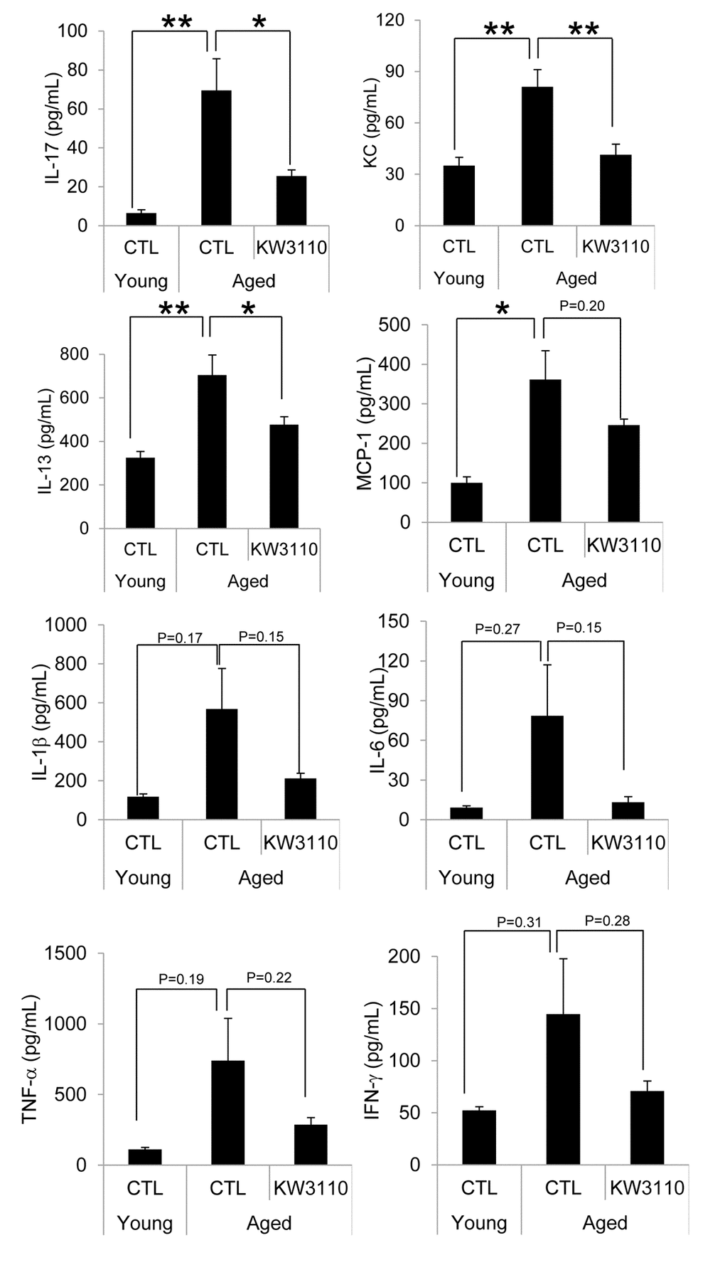 Figure 3. The levels of proinflammatory cytokines in the serum were mitigated in aged mice fed a diet containing Lactobacillus paracasei KW3110 as compared with age-matched control mice. Serum was collected and subjected to multiplex analyses to determine levels of cytokines (IL-1β, IL-6, IL-13, IL-17, IFN-γ, TNF-α, KC, and MCP1) in young (3-months-old) and aged mice (22-months-old). Values are presented as the means ± SEM. Significance was assumed if the p value was < 0.05. *p < 0.05; **p < 0.01. CTL = control diet; KW3110 = Lactobacillus paracasei KW3110 diet; IL = interleukin; IFN = interferon; TNF = tumor necrosis factor; KC = keratinocyte chemoattractant; MCP1 = monocyte chemoattractant protein 1.