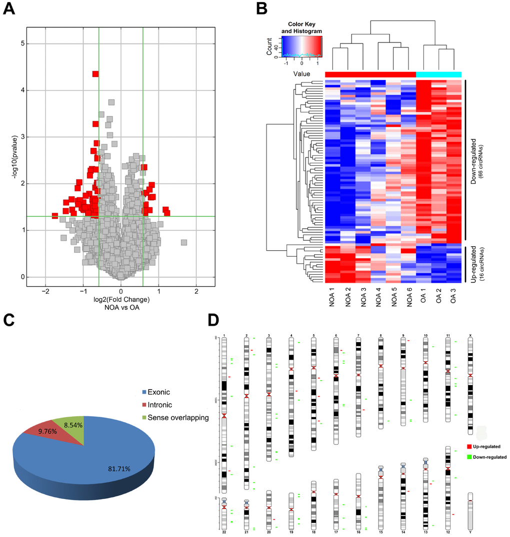 Figure 2. Characterization of differentially expressed circRNA in OA and NOA samples. (A) The volcano plots display the differential circRNAs expression between the two groups. Red points denote the differentially expressed circRNAs with statistical significance. (fold change ≥1.5 and p <0.05). (B) Heatmap shows the 16 up-regulated circRNAs and 66 down-regulated circRNAs in NOA. (C) The pie charts show the origin of transcription of differentially expressed circRNAs. (D) The chromosomal location of differentially expressed circRNAs is shown in the last figure. Red: up-regulated circRNAs in NOA; green: down-regulated circRNAs in NOA.