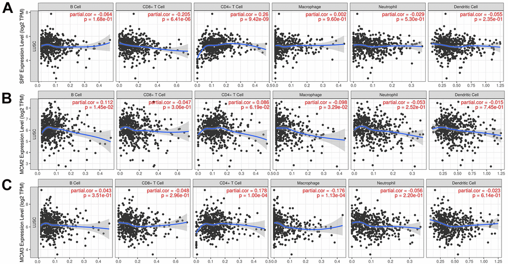 Figure 7. Relationship between mRNA expression of minichromosome maintenance (MCM) family and immune cell infiltration. (A–C) Analysis of association of MCM1–10 mRNA expression with the level of immune cell infiltration in lung squamous cell carcinoma (LUSC) using TIMER database.