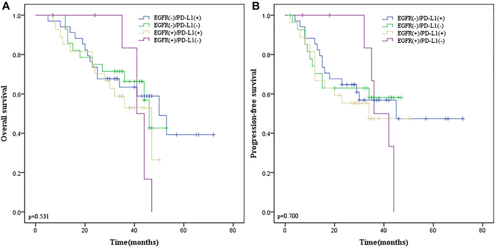 According to the positive relationship between EGFR and PD-L1, all patients were divided into 4 groups: EGFR (+)/PD-L1 (+), EGFR (+)/PD-L1 (−), EGFR (−)/PD-L1 (+) and EGFR (−)/PD-L1 (−). We found that EGFR and PD-L1 co-expression were not statistically correlated with OS (p = 0.304; Figure 7A) and PFS (p = 0.351; Figure 7B) by the Kaplan-Meier method and log-rank test.
