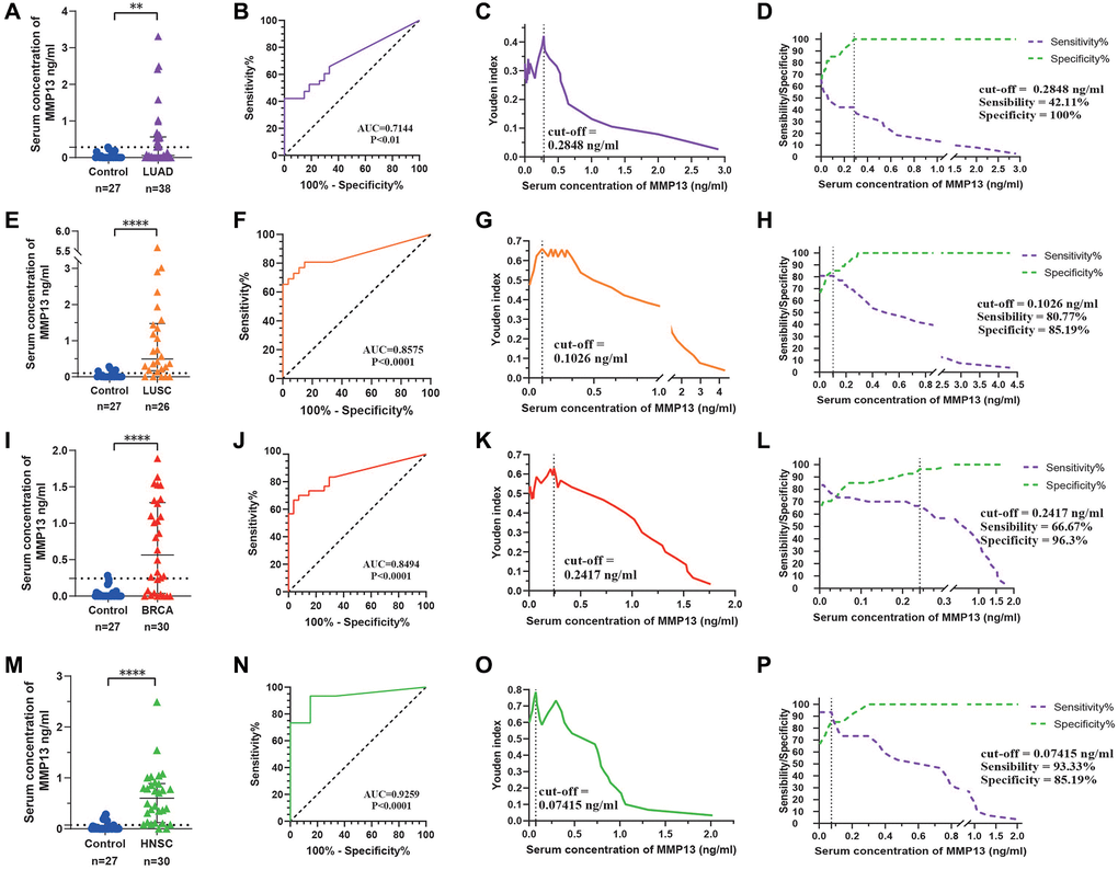 Figure 7. Evaluation of the diagnostic efficacy of serum MMP13. (A) Scatter plot analysis of serum concentrations of MMP13 in patients with LUAD and controls. (B) Serum MMP13 ROC curves for samples from patients with LUAD and control subjects. (C) Youden index and cut-off value in LUAD to serum MMP13 concentration. (D) Sensitivity and specificity in LUAD to serum MMP13 concentration. (E–H) Diagnostic tests for LUSC patients. (I–L) Diagnostic tests for BRCA patients. (M–P) Diagnostic tests for HNSC patients. The Mann-Whitney U-test was used for comparisons between the two groups. *P < 0.05, **P < 0.01, ***P < 0.001, ****P < 0.0001.