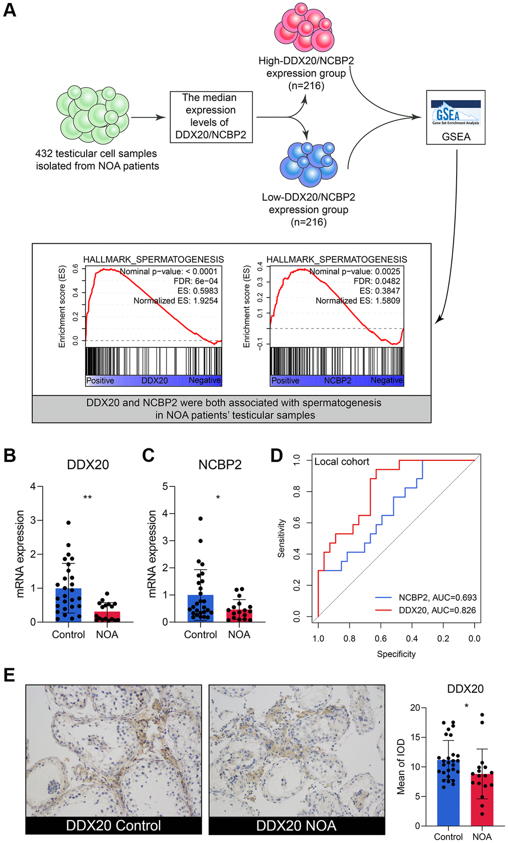 Figure 5. The external validation of DDX20 and NCBP2. (A) The single-cell RNA-sequencing analysis of 432 testicular cell samples isolated from NOA patients displayed that DDX20 and NCBP2 were both positively associated with spermatogenesis. (B, C) DDX20 (B) and NCBP2 (C) were down-regulated in the seminal plasma samples of NOA patients from the local hospital. (D) The ROC curve exhibited the diagnosis ability of seminal plasma DDX20 and NCBP2 to NOA in the local cohort. (E) The protein expression levels of DDX20 were obviously down-regulated in the testicular samples from NOA patients in the local cohort, which were detected by the immunohistochemical staining. Abbreviation: ROC: receiver operating characteristic.