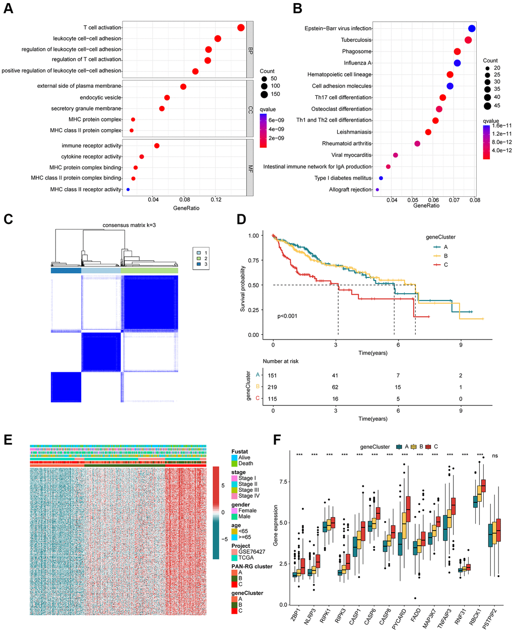 Figure 4. Identification of DEGs in the PAN-RG molecular subtypes. (A) GO and (B) KEGG enrichment assessment of the PAN-RG cluster-based DEGs. (C) Unsupervised consensus clustering of the DEGs in HCC. (D) Clinical prognosis analysis of HCC in gene-cluster subgroups. (E) Heatmap plot illustrates the relationship of clinical variates and prognostic DEGs in PAN-RG- and gene-cluster subgroups. (F) PAN-RGs expression landscape of HCC in gene-cluster A, B, and C.