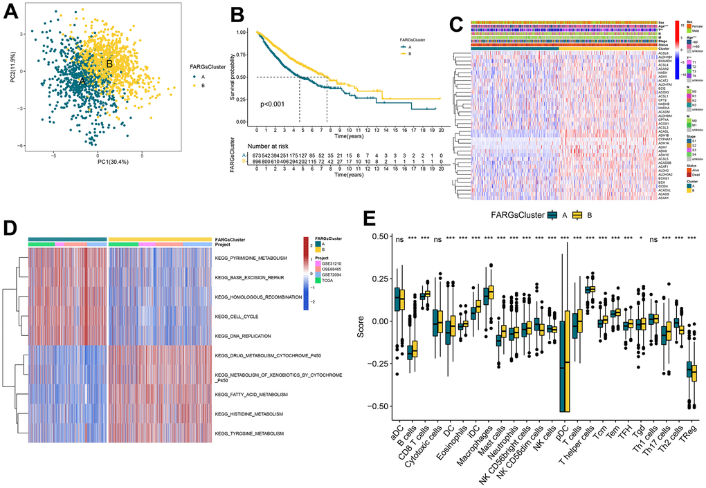 Figure 3. Consistent clustering for FARGs clusters, biological processes, and characteristics of immune infiltration cells of each cluster. (A) PCA plot based on the FARGs. (B) Kaplan–Meier survival curves for the different FARGs clusters. (C) Heatmap for different clinicopathologic features and expression levels of FARGs between two clusters. (D) GSVA of biological pathways between two clusters. (E) Different expressions of immune infiltration cells in each FARGs cluster. ns, not significant, *P < 0.05, **P < 0.01, ***P < 0.001, ****P < 0.0001.