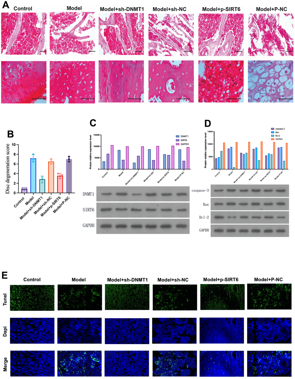 Figure 1. DNMT1 was up-regulated and the expression of SIRT6 was down-regulated in the nucleus pulposus tissue of IDD rats. (A) Hematoxylin and eosin stain were used to detect the damage to the nucleus pulposus tissue of the rats in each group at 12 weeks. (B) Histological damage score significantly increased in the model group and was improved by inhibition of DNMT1 and overexpression of SIRT6 respectively (p<0.05). (C) Protein relative expression level of DNMT1 detected by western blot. (D) Western blot detection of apoptosis-related proteins including caspase-3, BAX, and BCL-2. DNMT1 inhibition and SIRT6 overexpression significantly inhibited apoptosis p<0.05. (E)TUNEL apoptosis assay of nucleus pulposus cells.
