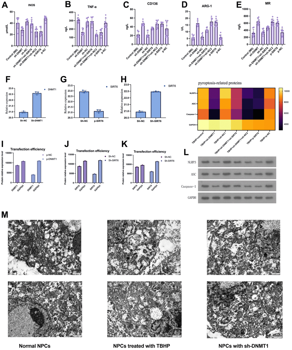 Figure 5. DNMT1/SIRT6 axis can affect the pyroptosis of nucleus pulposus cells by regulating macrophage polarization. (A–E) The expression of M1/M2 macrophage specific markers detected by ELISA. (F–K) Western blot and quantitative PCR to evaluate the transfection efficiency. (L) Heatmap of pyroptosis-related proteins expression which detected by western blot. (M) Transmission electron microscopy showed the autophagosomes in NPCs.