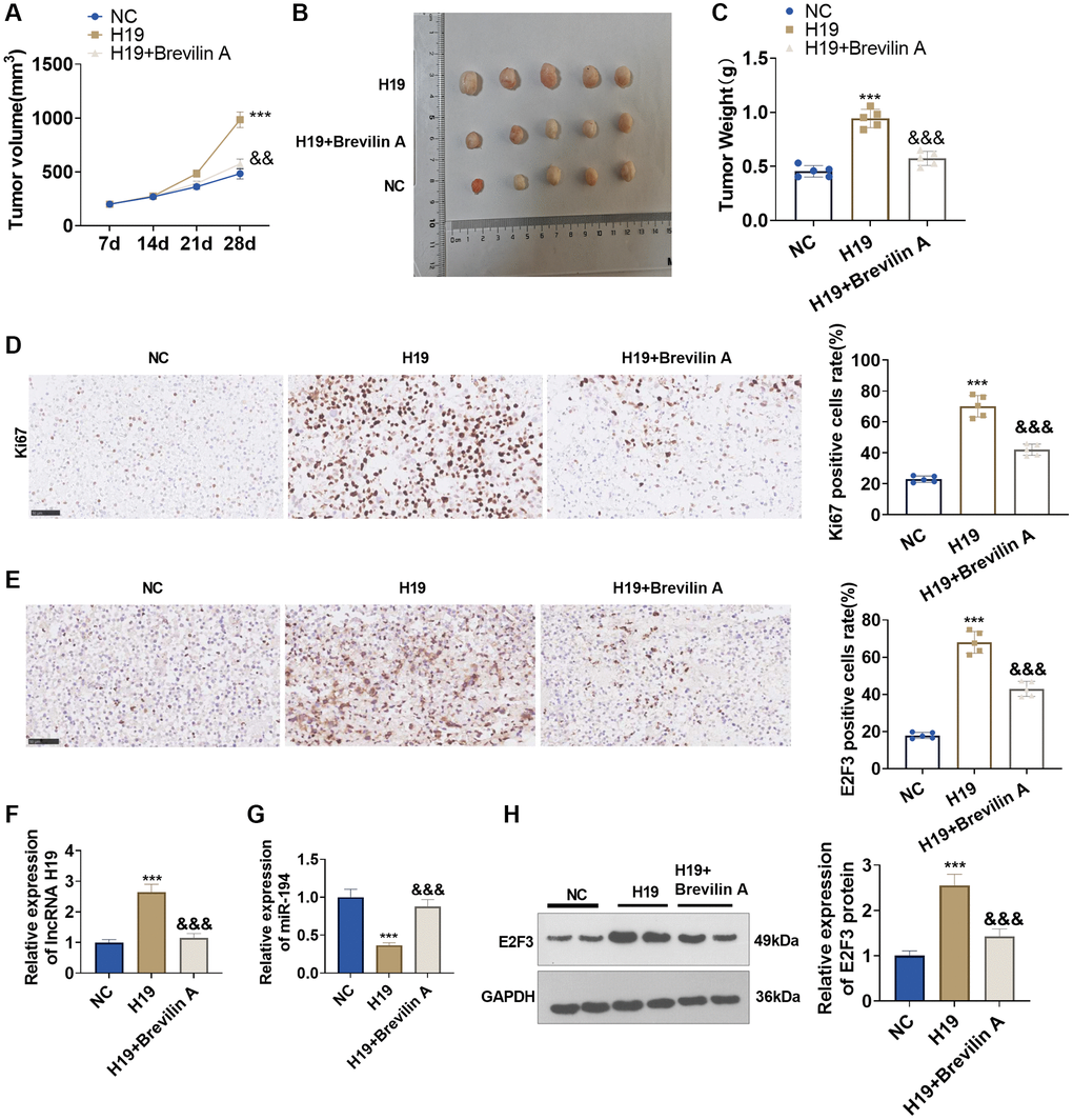 Figure 8. The functions of Brevilin A and lncRNA H19 in the prostate cancer nude mouse xenograft model. DU145 cells, stably transfected with lncRNA H19 overexpression plasmids, were taken to construct a nude mouse xenograft model of prostate cancer, and Brevilin A was harnessed for treatment. The tumors were excised 28 days later. (A) The tumor volume. (B) The images of tumors. (C) The tumor masses. (D, E) Immunohistochemistry determined Ki67 and E2F3 expressions. (F, G) qRT-PCR examined the profiles of lncRNA H19 and miR-194. (H) Western blot was used for examining E2F3 protein level. ***P < 0.001 (vs. NC); &&P < 0.01, &&&P < 0.001 (vs. H19), n = 5.