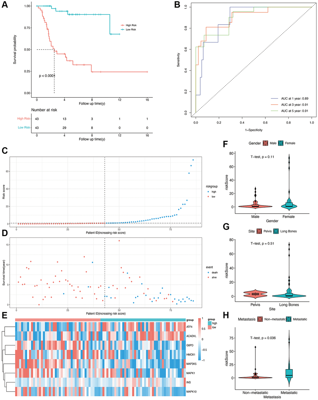 Figure 2. Construction of OS-related prognostic model for osteosarcoma in the TARGET cohort. (A) Kaplan-Meier curves showing the overall survival in the high-risk and low-risk groups (p < 0.0001). (B) AUCs for 1-, 3-, and 5-year survival according to the ROC curves. (C) The risk score curve of each patient. (D) The distribution of survival status. (E) The heatmap of eight OS-related genes between the high- and low-risk groups. (F, G, H) Risk scores in the gender, site, and metastasis subgroups.