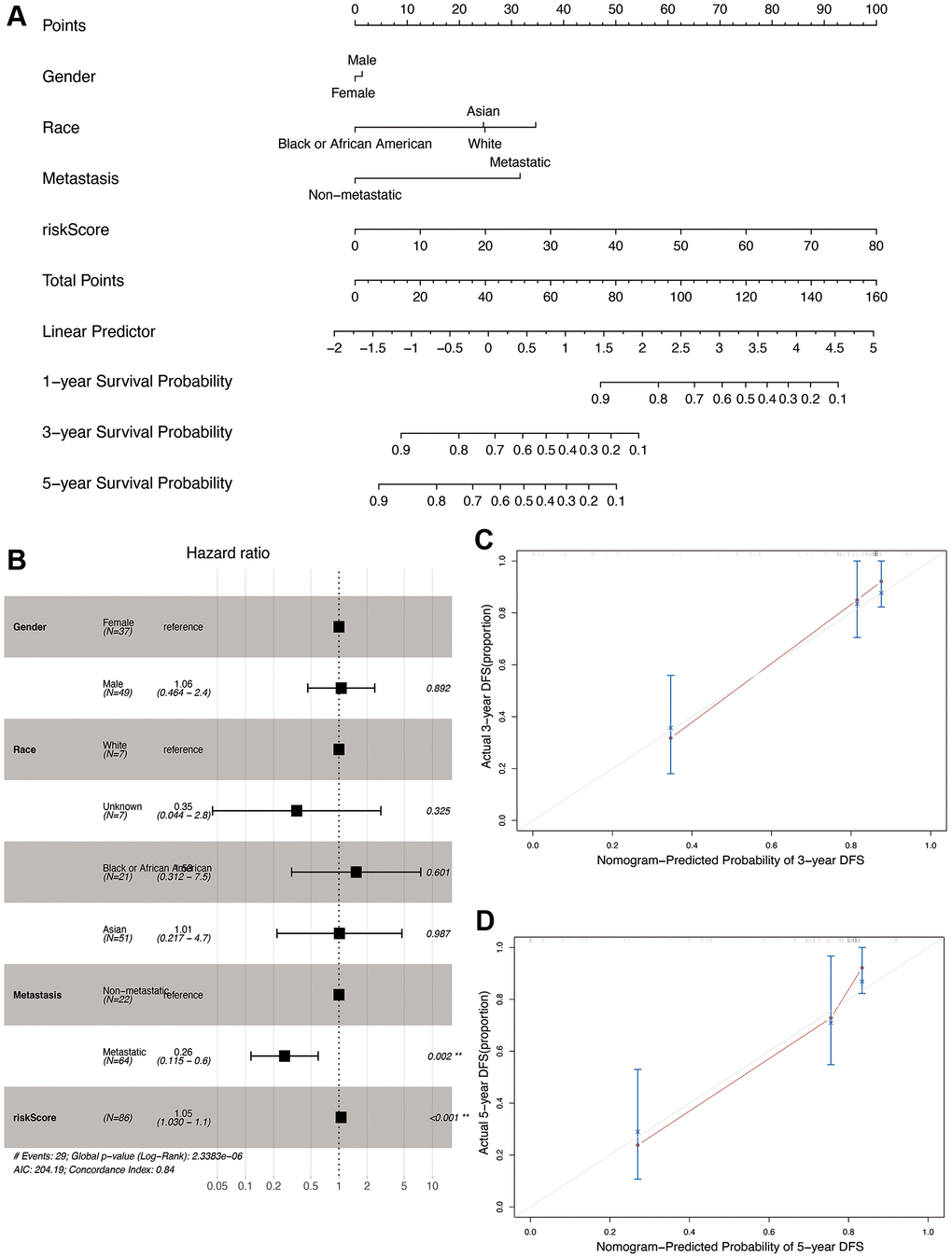 The prognostic model was integrated with the clinical characteristics including gender, race, metastasis, and risk score to build a nomogram using the Survminer package in R. The predictive accuracy of the nomogram was validated by C-index and comparison of the fitting degree between the observed and optimized values was performed.