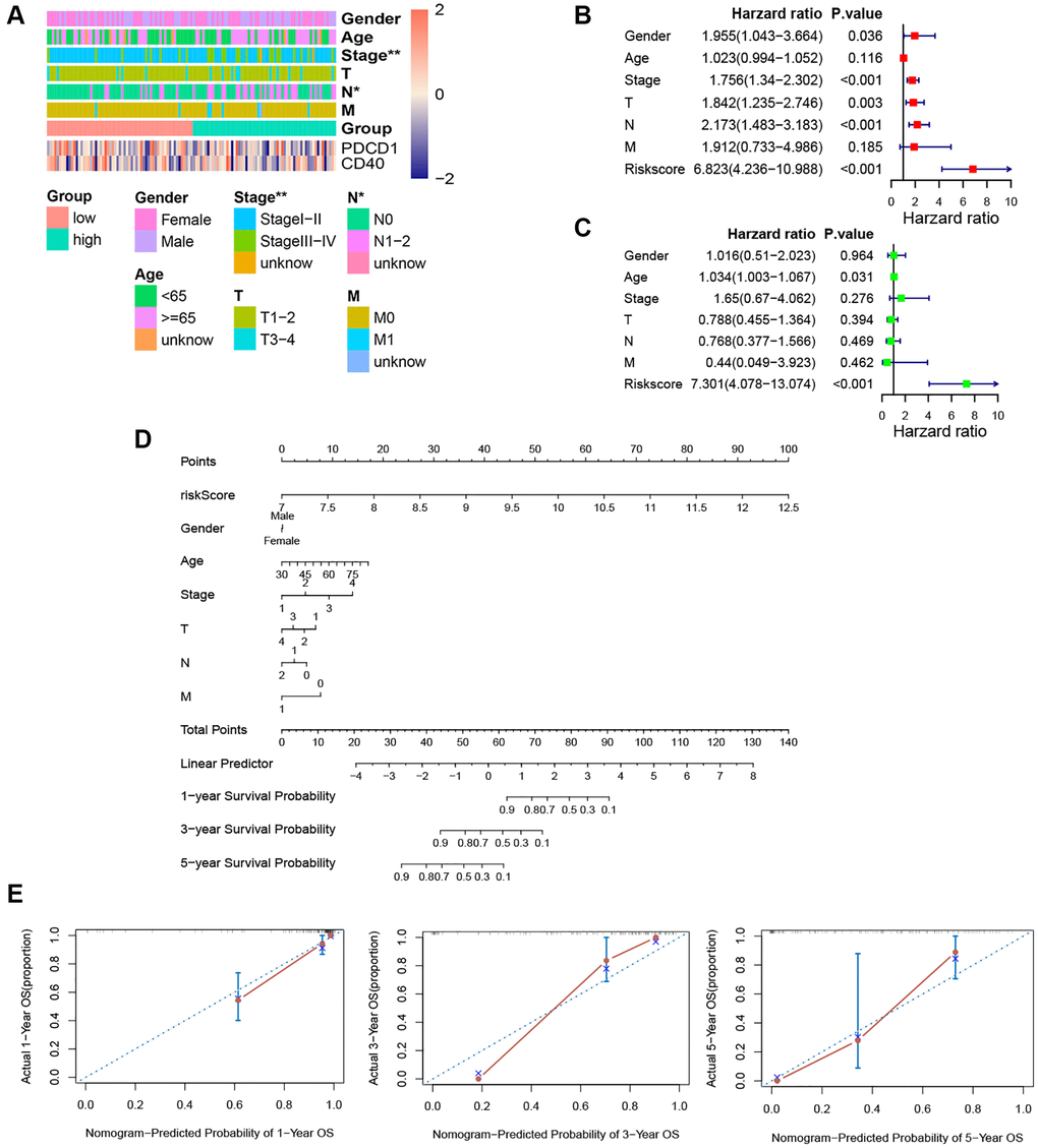 Through chi-analysis, we found that high-risk samples were associated with later stage and more lymph node metastases (Figure 7A). Merged with clinicopathological data, the univariate Cox analysis identified that risk score, gender, stage, and N-stage were potential independent predictive factors (Figure 7B). And according to multivariate Cox result, only the risk score was the independent predictive factor (Figure 7C). The C-index of this nomogram was 0.89 (Figure 7D). And predictive curves of 1-, 3-, and 5-year OS were very close to the curves of real OS (Figure 7E). These elucidated the nomogram had extremely high predictive accuracy.
