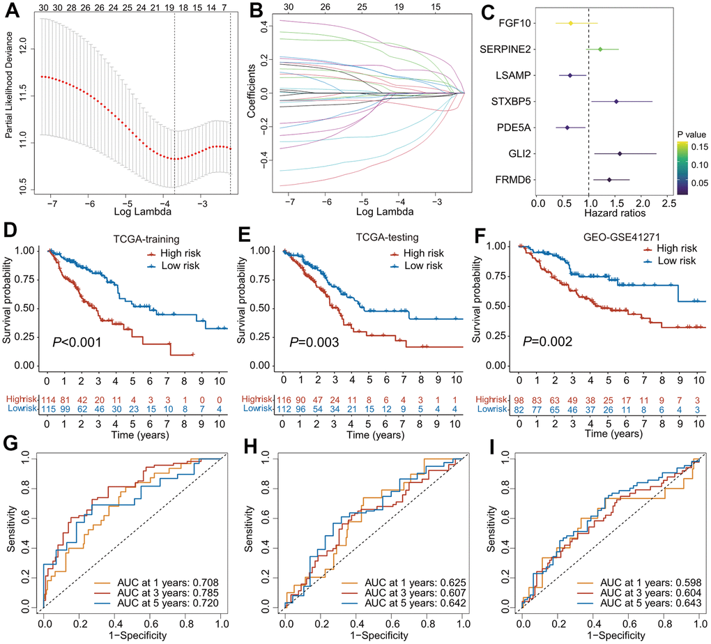 Figure 2. The construction of predictive model for overall survival based on CAFs-related genes. (A) Partial likelihood deviance of variables displayed by the Lasso regression model. The red dotted gray lines and two vertical lines represented the partial likelihood of deviance values, respectively. (B) Lasso coefficient profiles of 30 OS-related genes in TCGA training cohort. (C) Forest plot of CAFs-related risk signature (CAFRS) consisting of 7 genes identified by the multivariate Cox regression model. (D–F) Kaplan-Meier curves of patients from TCGA training, TCGA testing and GEO cohorts stratified by low- and high-risk subgroups. (G–I) Receiver operating characteristic (ROC) curves with 1-, 3-, and 5- year AUC values in the TCGA training, TCGA testing and GEO cohorts.