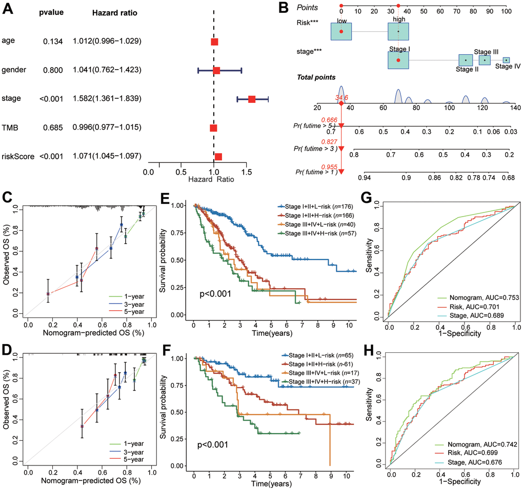 Figure 7. The predictive performance of CAFRS in combination with TNM stage in OS for LUAD patients. (A) The forest plot of multivariate Cox regression analysis for OS of TCGA-LUAD. (B) Nomogram of predicting 1-, 3-, and 5- year OS for TCGA-LUAD. (C, D) Calibration curves of the nomogram at 1-, 3-, and 5-year for LUAD patients from TCGA and GSE41271. Gray line indicates the ideal curve. The green, blue and red lines indicate bias-corrected curve at 1-, 3-, and 5-year. Dots are quartiles of our data set. (E, F) Kaplan-Meier curves of LUAD patients from TCGA and GSE41271 stratified by TNM stage and riskscore. (G, H) The ROC curves of TCGA and GSE41271 illustrating the AUC values of nomogram, CAFRS and TNM stage at 5-year.