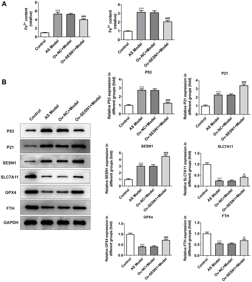 Figure 3. Overexpression of SESN1 inhibited ferroptosis in AS mice. (A) Immunofluorescence was used to detect the iron metabolism in vascular tissues. (B) The expressions of SESN1, P53, P21 and ferroptosis-related proteins were detected by western blot. ***P < 0.001 vs. Control; #P < 0.05, ###p < 0.001 vs. Ov-NC+Model.