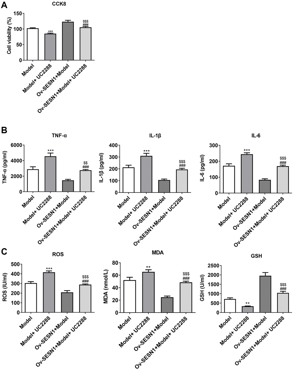 Figure 6. Overexpression of SESN1 increased cell activity and inhibited cellular inflammation and oxidative stress responses in ox-LDL-induced HUVECs via activating P21. (A) CCK8 was used to detect the cell activity. (B) ELISA was used to detect the levels of inflammatory factors in cells. (C) The kits were used to detect the expression of oxidative stress-related factors ROS, MDA and GSH. ***P < 0.001 vs. Model; ###P < 0.001 vs. Model+UC2288; $$P < 0.01, $$$P < 0.001 vs. Ov-SESN1+Model.