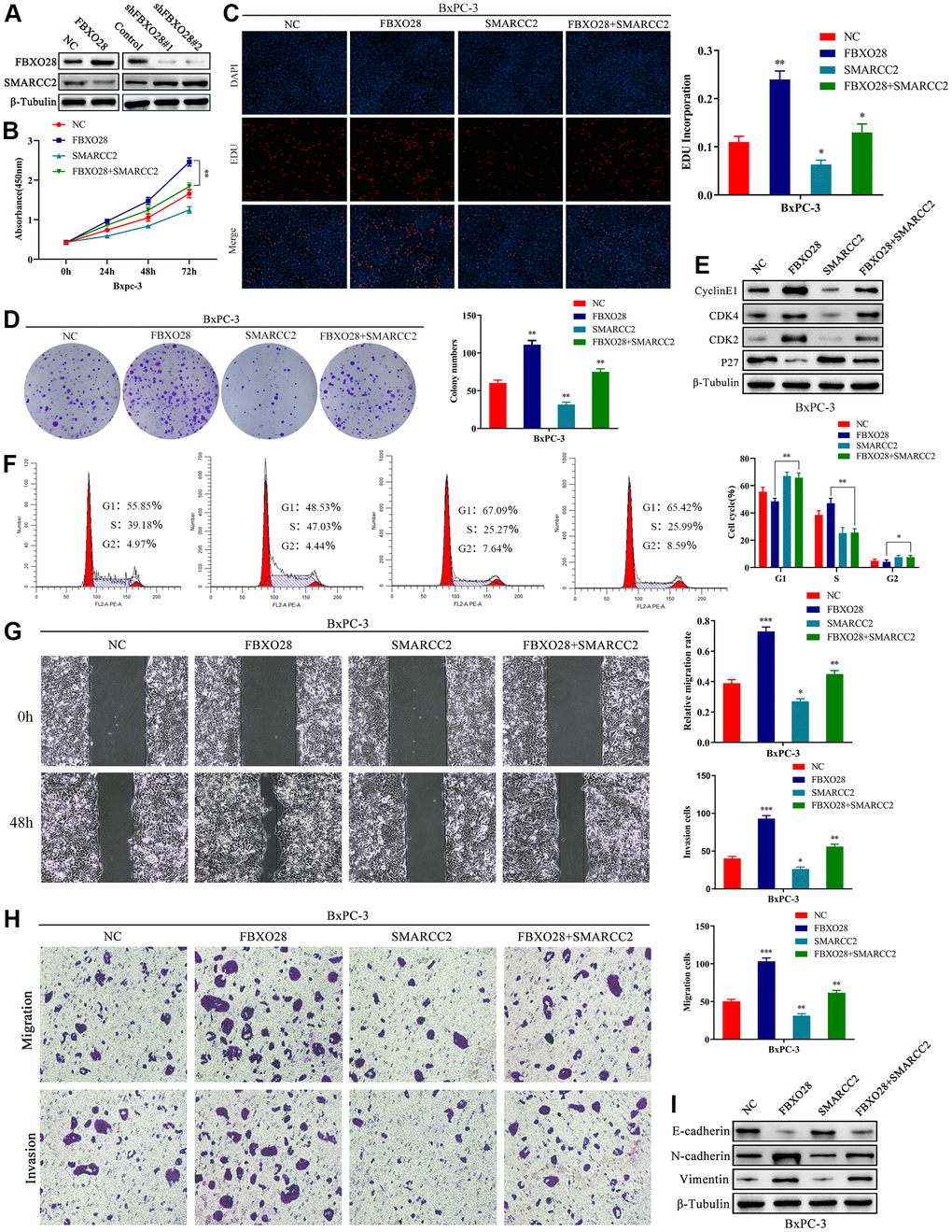 Figure 5. SMARCC2 upregulation reverses the effect of FBXO28 overexpression. (A) Western blot analysis demonstrating that SMARCC2 expression is lower in cells overexpressing FBXO28 and higher after FBXO28 knockdown. (B–D) Cell Counting Kit-8 (CCK-8), EdU, and clone plate assays showing that SMARCC2 upregulation inhibits proliferation of FBXO28 overexpression-induced BxPC-3 cells. (E, F) Western blot and flow cytometry revealing that SMARCC2 upregulation inhibits FBXO28 overexpression-induced BxPC-3 cell cycle. (G, H) SMARCC2 upregulation inhibited FBXO28 overexpression-induced BxPC-3 cell invasion and migration. (I) Western blot to observe the changes in epithelial-mesenchymal transition (EMT)-related proteins in each group following SMARCC2 overexpression. *P < 0.05 **P < 0.01, ***P < 0.001.