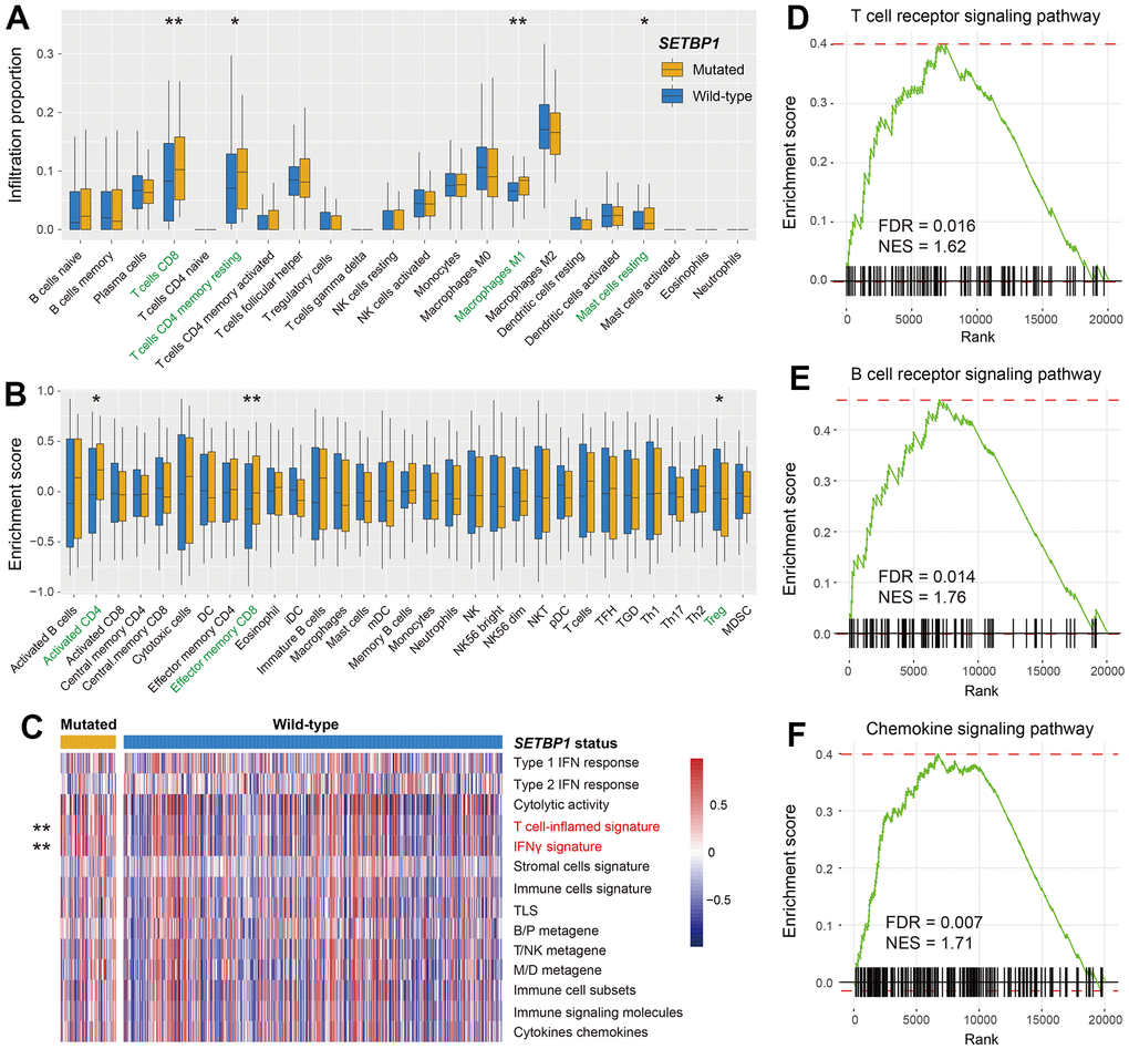 Figure 6. Immunological implications behind SETBP1 mutations in melanoma. (A) CIBERSORT algorithm revealed the 22 lymphocyte infiltration differences between SETBP1 mutated and wild-type subgroups. (B) Angelova et al. method revealed the 31 lymphocyte infiltration differences between SETBP1 two subgroups. (C) Heatmap illustration of enrichment scores of 14 immune-related molecular signatures according to SETBP1 mutational status. Signaling pathways of (D) T cell receptor signaling pathway, (E) B cell receptor signaling pathway, and (F) chemokine signaling pathway were enriched in SETBP1-MUT melanoma patients. * P < 0.05, ** P < 0.01.
