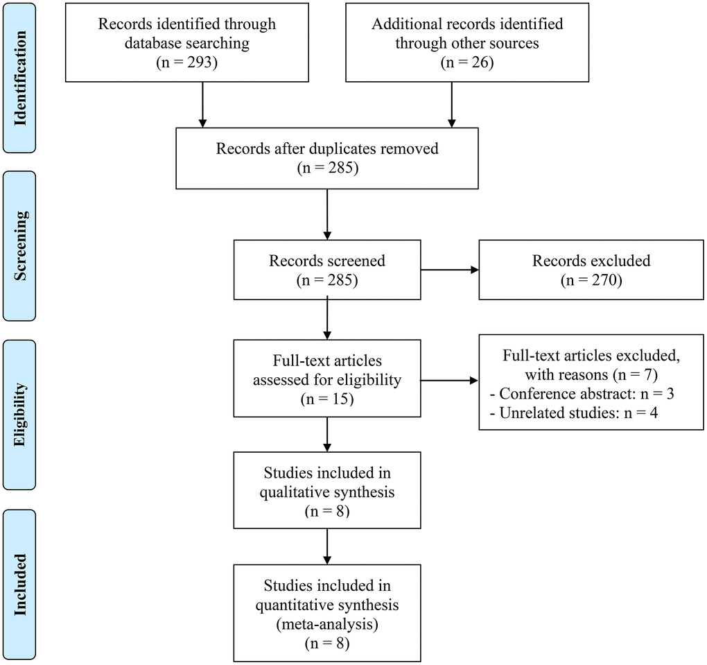 Following the initial search, 34 duplicate studies were excluded. Subsequently, after a thorough review of the titles and abstracts, 270 articles were removed. The remaining 15 articles were then subjected to a detailed examination of their full texts. Ultimately, eight articles, comprising a total of 383 patients, were selected for inclusion in the analysis [19–22, 25–28]. Figure 1 displays the PRISMA flow diagram illustrative of the selection procedure. The primary attributes of the studies examined are outlined in Table 1. For all publications, the NOS scores ranged from 6 to 8, indicating a low probability of bias.