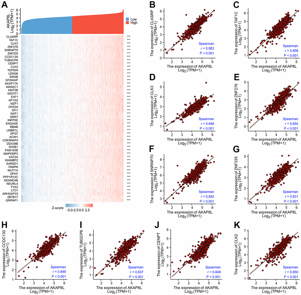 Top 50 genes correlated with AKAP8L expression in KIRC. (A) The gene co-expression heatmap of the top 50 genes correlated with AKAP8L in KIRC; (B–K) correlation analysis of the top 10 genes and AKAP8L in the heatmap.