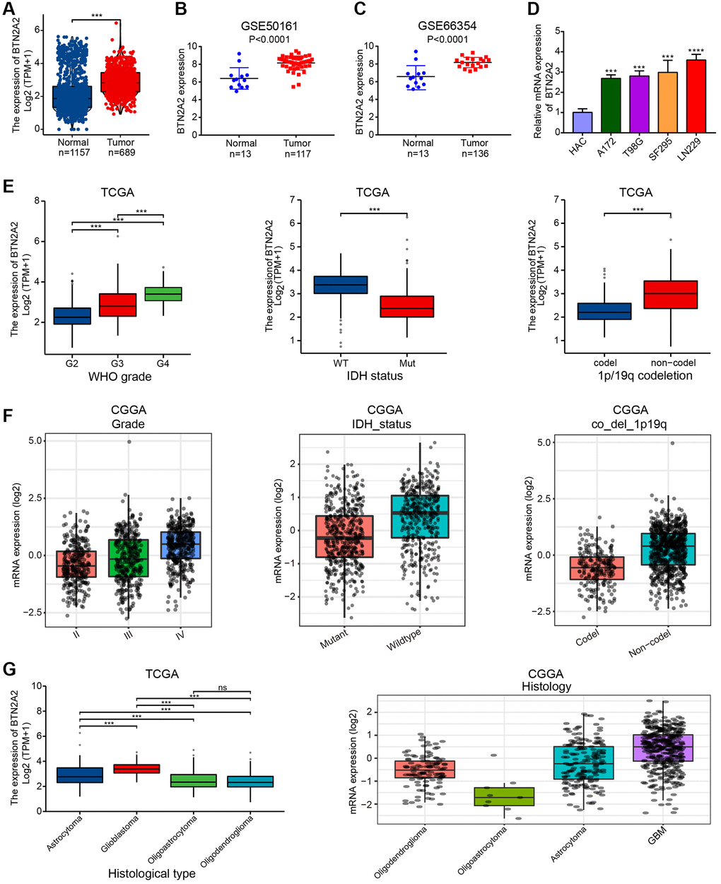 Figure 2. Correlation between BTN2A2 expression and CFs. (A) BTN2A2 expression in patients with glioma in TCGA cohort. (B, C) BTN2A2 expression in patients with glioma in GEO cohort. (D) BTN2A2 expression in normal human astrocytes cells (NHA) and glioma cells (A172, T98G, LN229, and SF295) was determined using qRT-PCR. (E–G) Correlation between BTN2A2 expression and CFs (grade, IDH status, 1p/19q codeletion, age, primary therapeutic outcome, and histological type). *P < 0.05, **P < 0.01, ***P < 0.001.
