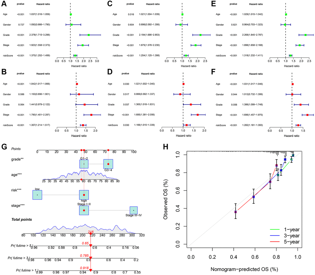 Figure 6. Independent prognostic validation of risk signatures and development of clinical nomogram. Univariate and multivariate Cox regression analysis results were presented in the form of forest plots in the training (A, B); testing (C, D); and entire (E, F) cohorts; respectively. (G) Nomogram to quantitatively predict 1; 3; and 5-year OS in KIRC patients. (H) The calibration curves of this nomogram.