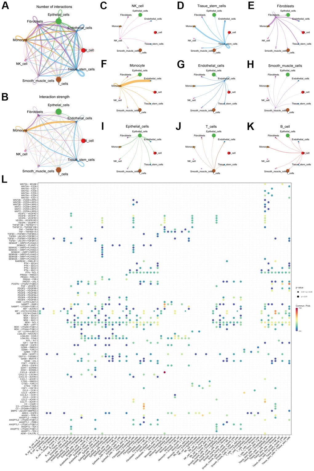 Figure 3. Cell communication analysis of scRNA-seq data. (A) Network diagram showing the number of connections between different cell types. (B) Network diagram showing the weight of connections between different cell types. (C–K) Diagram of the communication network between different cells and other cells. (L) Bubble plot showing genes involved in cell communication.