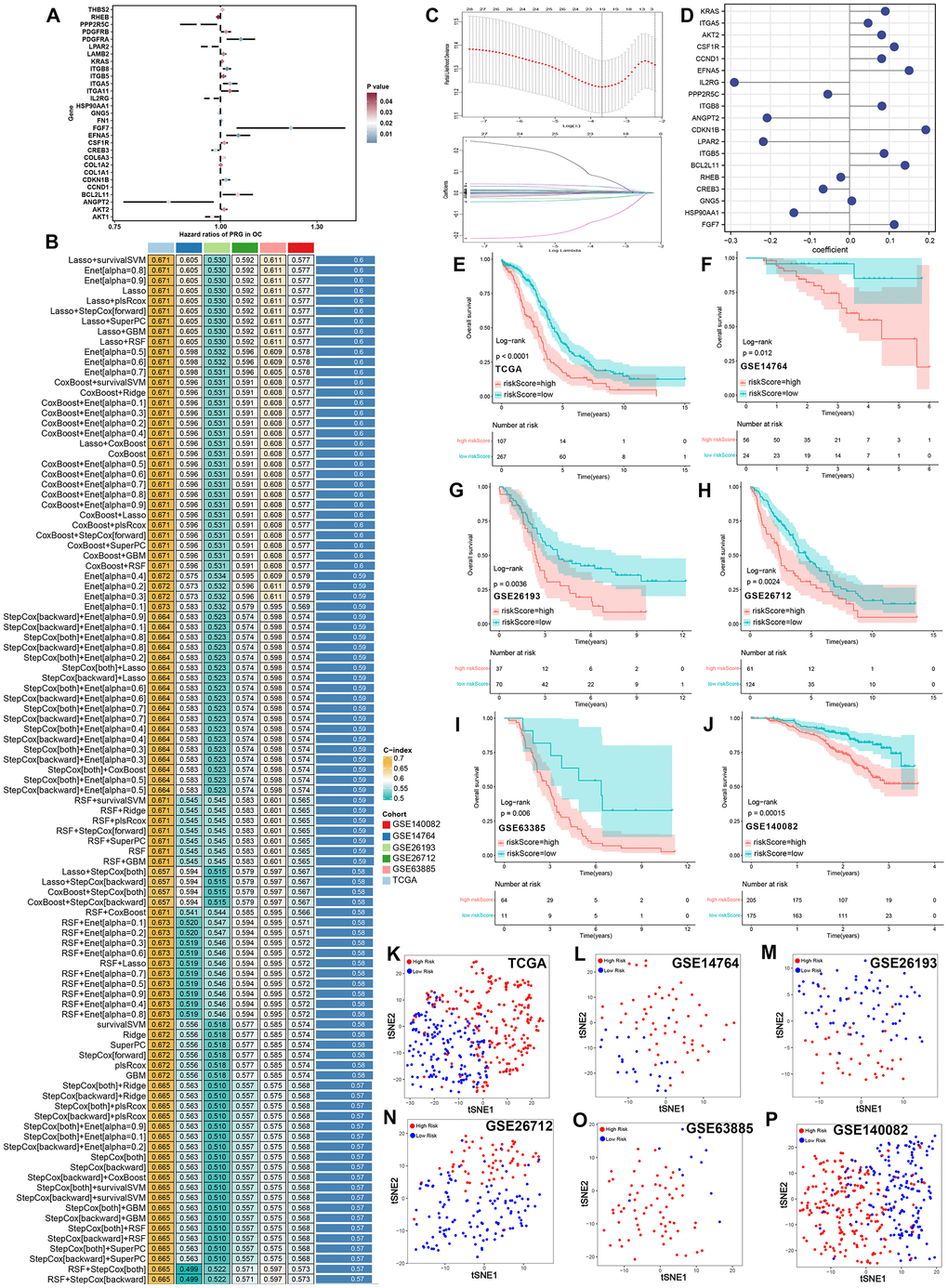 Figure 1. Integrative machine learning analysis constructed a prognostic PI3K/Akt pathway related signature. (A) Potential biomarker identified by univariate cox analysis. (B) The C-index of 101 kinds prognostic models constructed by 10 machine learning algorithms in training and testing cohort. (C) The determination of the optimal λ was obtained when the partial likelihood deviance reached the minimum value, and further generated Lasso coefficients of the most useful prognostic genes. (D) Coefficients of 19 genes finally obtained in survivalSVM regression. The survival curve of ovarian cancer with high and low risk score in TCGA (E), GSE14764 (F), GSE26193 (G), GSE26172 (H), GSE63885 (I) and GSE140082 (J) cohort. Cluster analysis of ovarian cancer cases with high and low risk score in TCGA (K), GSE14764 (L) GSE26193 (M), GSE26172 (N), GSE63885(O) and GSE140082 (P) cohort by using tSNE method.