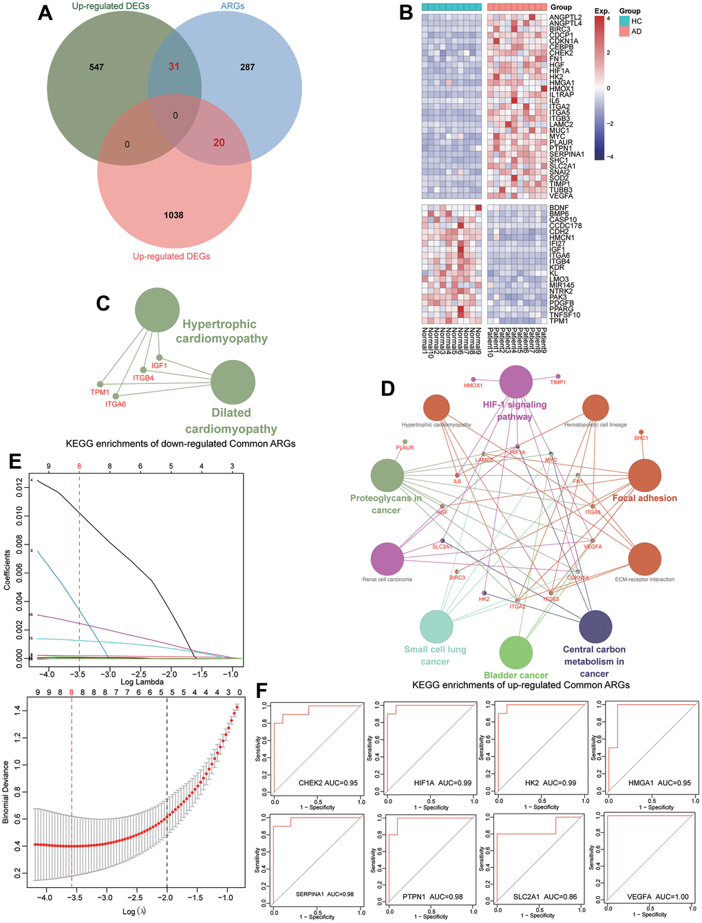Figure 3. Identification of diagnostic ARGs and ROC evaluation for TAAD patients. (A) Veen plots identified 31 up-regulated and 20 down-regulated differential ARGs. (B) The expression of differential ARGs between TAAD and HC tissues in heatmaps. (C, D) The KEGG functional analysis of up-regulated and downregulated differential ARGs. (E) The results of LASSO regression screening the eight diagnostic ARGs for TAAD. (F) The ROC analysis revealed that these diagnostic ARGs exhibited prominent diagnostic efficiency for TAAD patients with high AUC values including CHEK2/0.95, HIF1A/0.99, HK2/0.99, HMGA1/0.95, SERPINA1/0.98, PTPN1/0.98, SLC2A1/0.86 and VEGFA/1.0.