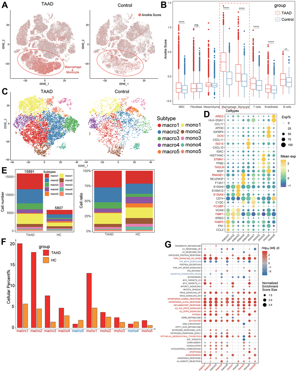 We also compared the levels of anoikis scores between TAAD and HC groups in each cellular subtype and indicated the elevation of scores was primarily focused on macrophages and monocytes (Figure 7A, 7B). Moreover, we further defined 10 classifications of macrophages and monocytes (5 subtypes for each cell) and annotated them with significant markers, including FCGBP+ mono1, TAGLN+ mono2, STMN1+ mono3, DCN+ mono4, AREG+ mono5, FABP5+ macro1, TIMP1+ macro2, S100A8+ macro3, RNASE1+ macro4 and ISG15+ macro5 (Figure 7C, 7D). Except macro5 and mono4, the cellular ratios of most macrophages and monocytes were significant elevated in TAAD patients, particularly in macro1-4 and mono1 (Figure 7E, 7F). The GSEA further demonstrated that macrophages and monocytes were major vital cells for TAAD, with the coincident activation of multiple inflammatory and metabolic signaling pathways (Figure 7G).