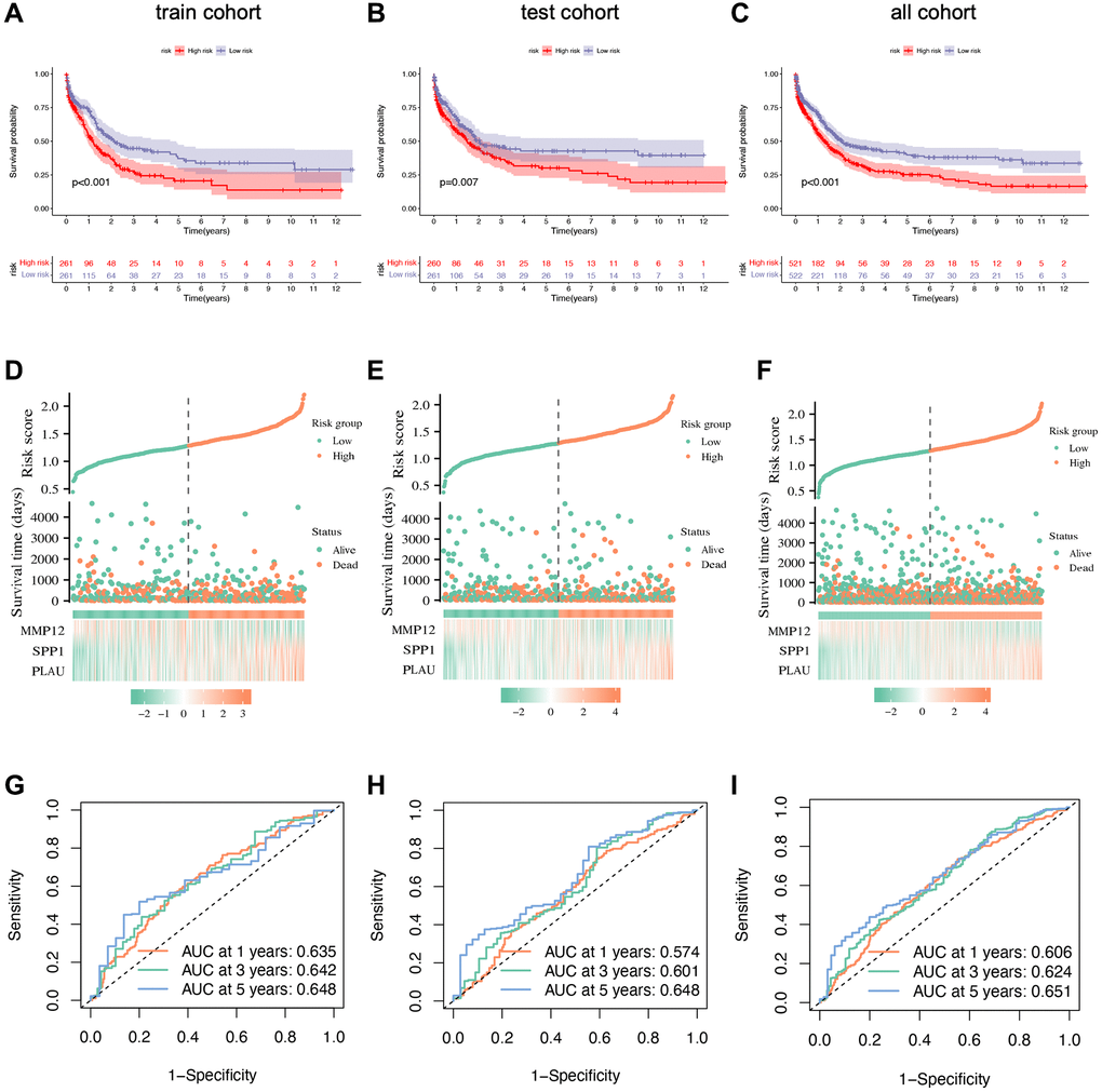 where the expression of each gene and risk coefficient are represented by Expi and Coefi, respectively. Patients in the training, testing, and all sets are categorized into low-risk and high-risk score groups based on median score. Each group conducts a corresponding Kaplan-Meier survival analysis, and further creates receiver operating characteristic (ROC) curves.