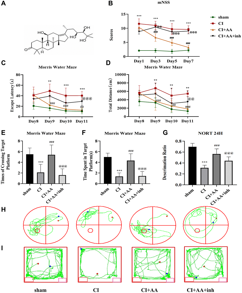 Figure 1. Alisol A improved neurological deficits and cognitive impairment after CI. (A) The molecular formula of alisol A. (B) Neurobehavioral function of mice was evaluated by mNSS at 1, 3, 5, and 7 days after CI, n = 10. (C) Escape latency of each group in the MWM training stage. (D) Total distance traveled by each group in the MWM training stage. (E) Frequency of crossing the target quadrant of each group in the MWM test. (F) Time spent in the target quadrant of each group in the MWM test. (G) Discrimination ratio of each group in NORT. (H) Representative tracking images in the MWM test. (I) Representative tracking images in NORT, n = 10. Data are shown as the mean ± SD. **P < 0.01, ***P < 0.001 compared with the sham group, ##P < 0.01, ###P < 0.001 compared with the CI group, @@P < 0.01, @@@P < 0.001 compared with the CI+AA group. Note: sham-operated group (sham group); cerebral ischemia group (CI group); cerebral ischemia + alisol A (CI+AA group); cerebral ischemia + alisol A+AKT inhibitor group (CI+AA+inh group).