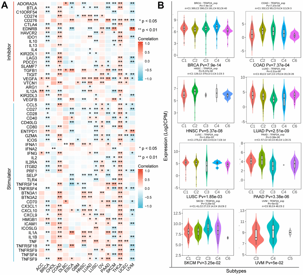 Figure 6. The relationship between TFAP2A expression and immune characteristics. (A) Co-expression analysis of TFAP2A with ICP genes in ACC, BRCA, CHOL, COAD, DLBC, ESCA, GBM, HNSC, LUAD, LUSC, OV, PAAD, SKCM, THCA, UCEC, UVM; (B) Analysis of TFAP2A expression with immune subtypes in BRCA, COAD, HNSC, LUAD, LUSC, PAAD, SKCM, UVM.