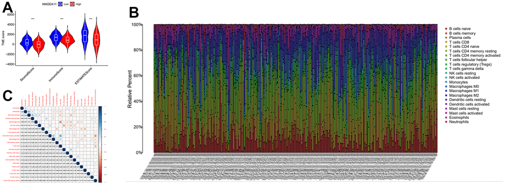 Figure 7. The relationship between MAGE-A11 expression and the tumour microenvironment. (A) Stromalscore, Immunescore and ESTIMATE score differences between MAGE-A11 high and low expression groups. (B) Proportion of tumor-infiltrating immune cells in each sample. (C) Relationship between tumor-infiltrating cells.