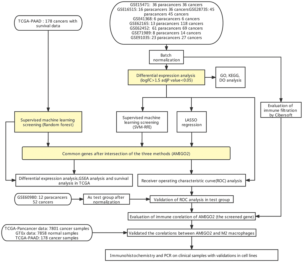 With the development of gene sequencing technology, bioinformatical manipulation was proposed to delineate the characteristic of different types of cancer in multiple biological process [6–8]. However, the efficacy of most gene signatures is not able to meet the expectations of clinical application. In this grim situation, it is necessary to find novel, reliable prognostic biomarkers. Machine learning algorithm is developing rapidly and some robust machine learning method was executed on multiple types of cancers [9–12]. However, to date, combined use of several machine learning and statistical methods in different PDAC sequencing datasets has not been reported.