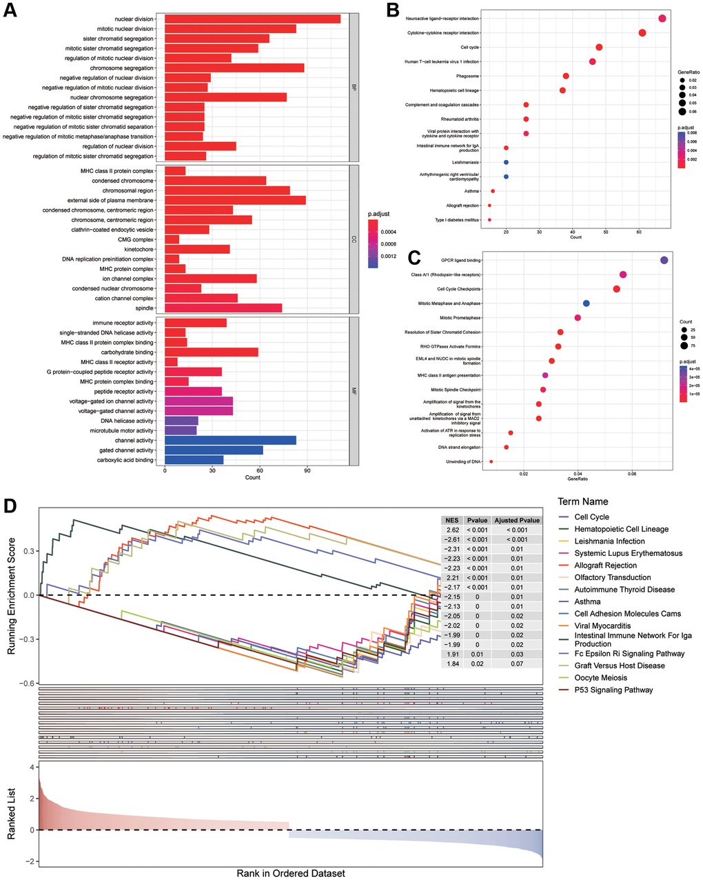 To comprehend the differences between various risk groups, differential expression analysis was undertaken. Based on the filtering criteria of | log2FC | greater than 0.5 and P < 0.05, 2200 DEGs (consisting of 1085 increasing and 1115 decreasing genes) in various risk groups in the training cohort were acknowledged. Afterwards, GO, KEGG and Reactome enrichment analyses were conducted to reveal the changes in biological functions. The enrichment of MFs and CCs are mainly related to the immunity, such as MHC class II protein complex and MHC protein complex in MFs, immune receptor activity and MHC class II protein complex binding in CCs (Figure 5A). While, from the outcomes of BPs, we discovered that these DEGs had a tight association with cell cycle because they could take part in nuclear division, mitotic nuclear division and sister chromatid segregation. In addition, several KEGG and Reactome pathways revealed that the distinction in risk subgroups may have relationships with Neuroactive ligand−receptor interaction, Asthma, Amplification of signal from the kinetochores as well as Activation of ATR in response to replication stress (Figure 5B, 5C). Then, a Gene Set Enrichment Analysis (GSEA) was conducted, revealing the potential involvement of asthma, cell adhesion molecules (CAMs) and cell cycle in the observed differences between the groups (Figure 5D).