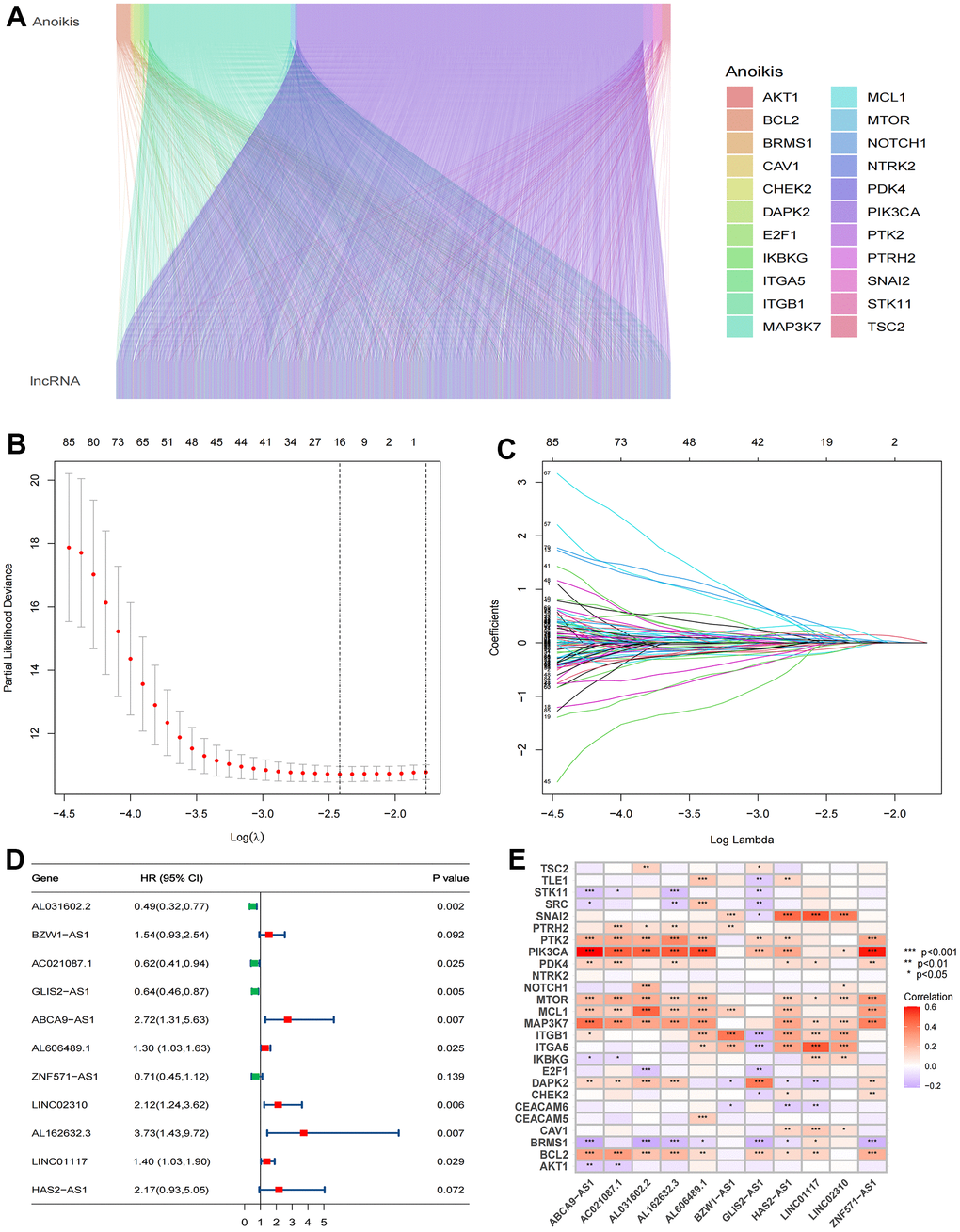 Figure 3. Identification of significant prognosis ARlncRNAs. (A) Sankey diagram depicting the relationships between 27 anoikis-related genes and ARlncRNAs co-expression. (B) LASSO Cox regression analysis revealed 85 ARlncRNAs based LASSO cross validation plot. (C) LASSO coefficient of 85 ARlncRNAs. (D) Forest plot showed different ARlncRNAs for high and low risk, with red representing high-risk lncRNAs and green representing low-risk ARlncRNAs. (E) Correlation heatmap showed the relationship between 11 ARlncRNAs and anoikis-related genes for the signature. Red represents positive correlations and blue represents negative correlations.