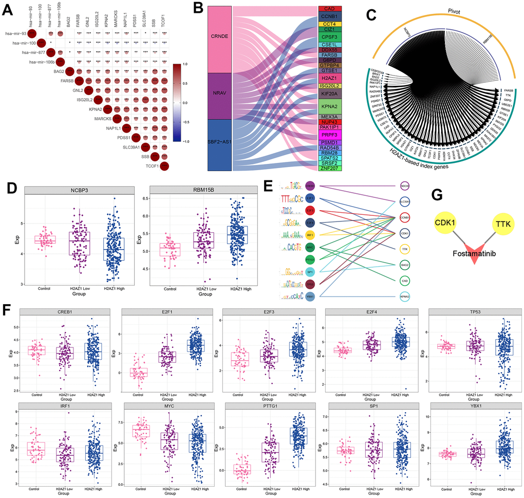 Figure 6. Transcription factor prediction based on H2AZ1-based index. (A) Triangular correlation heatmap - miRNAs showing the regulatory role of miRNAs on the H2AZ1-based index gene set. (B) Sankey diagram showing the regulation of lncRNAs on the H2AZ1-based index gene set. (C) Circle network diagram showing the regulation of RNA-binding proteins (RBPs) on the H2AZ1-based index gene set. (D) Box plots showing the transcriptional expression levels of some RBPs. (E) Bubble line-motif logo showing the regulatory effect of TF on the H2AZ1-based index gene set. (F) Box plots showing transcriptional expression levels of transcription factors (TFs). (G) Network diagram showing potential drug targets of the H2AZ1-based index gene set.