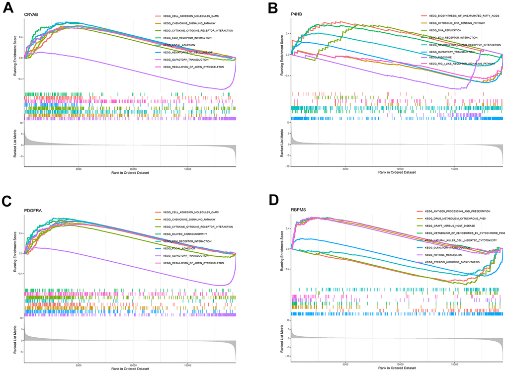 Figure 7. GSEA for samples with high and low expression of 4 central genes. (A) The enriched gene set obtained from KEGG for samples with high CRYAB expression. (B) The enriched gene set obtained from KEGG for samples with high P4HB expression. (C) The enriched gene set obtained from KEGG for samples with high PDGFRA expression. (D) The enriched gene set obtained from KEGG for samples with high RBPMS expression.