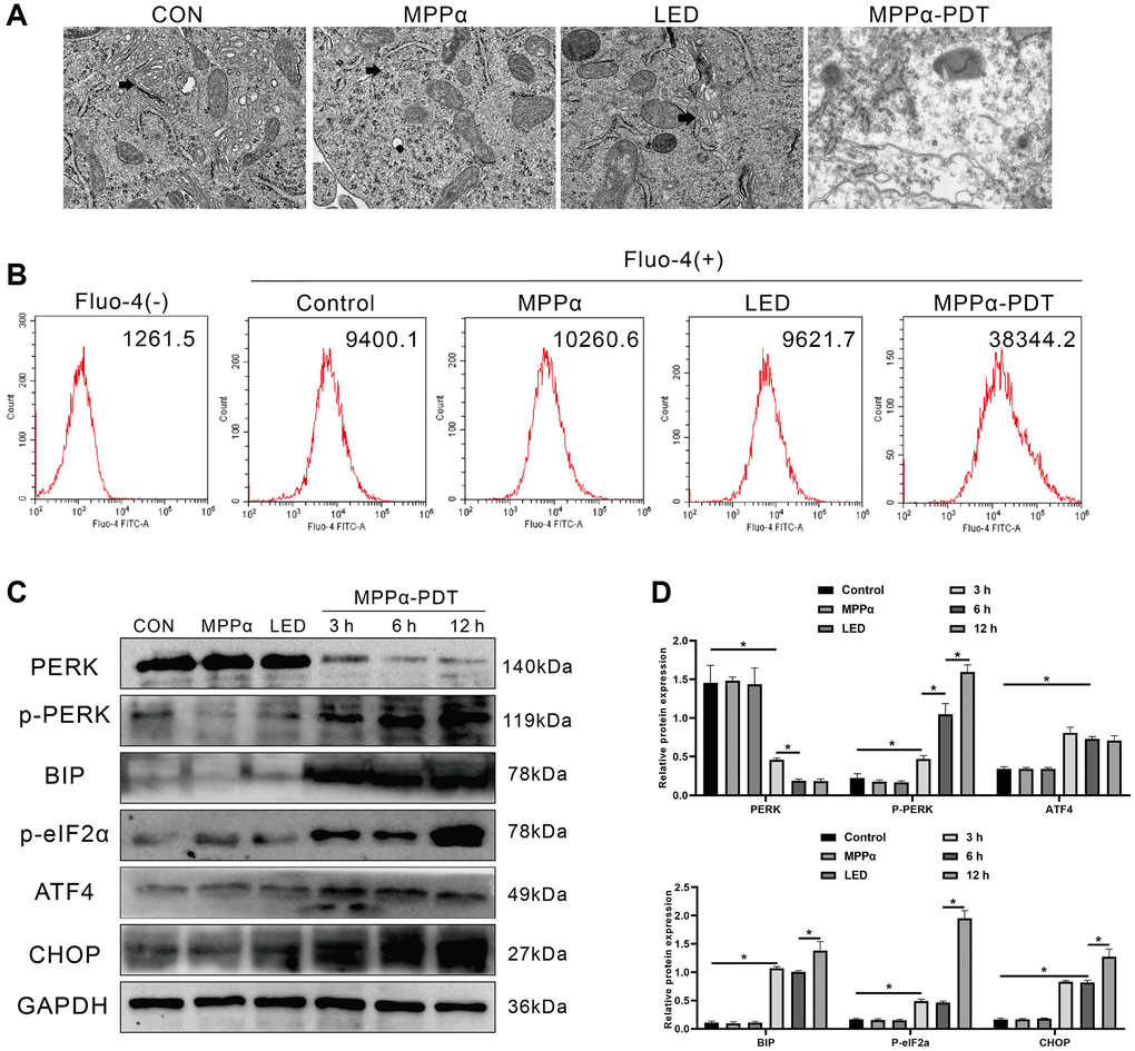 Figure 2. ER stress and PERK-eIF2α-ATF4 signaling pathway activation are induced by MPPα-PDT in HOS cells. (A) ER morphology was observed by TEM (magnification, ×20000). (B) Intracellular Ca2+ concentration was quantified by flow cytometry using Fluo-4-AM probe. (C, D) MPPα-PDT treated cells were harvested after 3, 6, and 12 h and PERK, p-PERK, BIP, p-eIF2α, ATF4, and CHOP, levels determined by western blot. Data are shown as mean ± SD of 3 independent experiments. *P < 0.05 vs. control group.