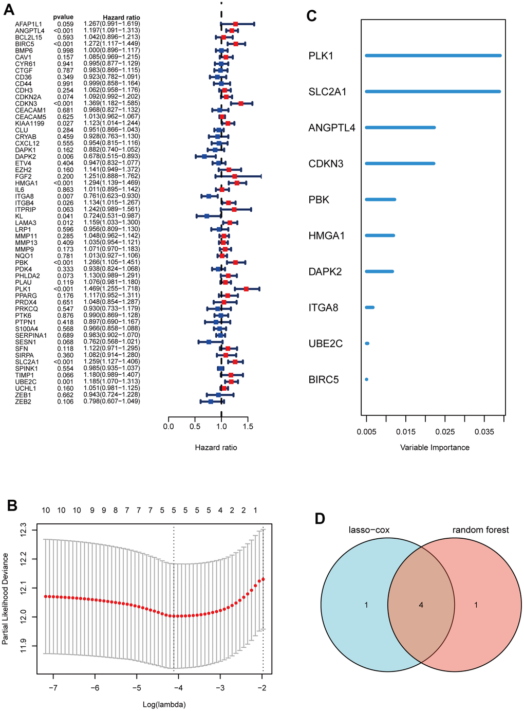 Figure 2. Construction of a prognostic signature based on ARGs. (A) Forest maps of univariate Cox analysis. (B) a minimum value of λ was chosen as optimal. The black dot line on the left represents those 10 features that were reduced to 5 non-zero coefficient features by LASSO. (C) ARGs rank importance by random forest algorithm. (D) Venn diagram shows the intersection ARGs of Lasso and random forest algorithm.