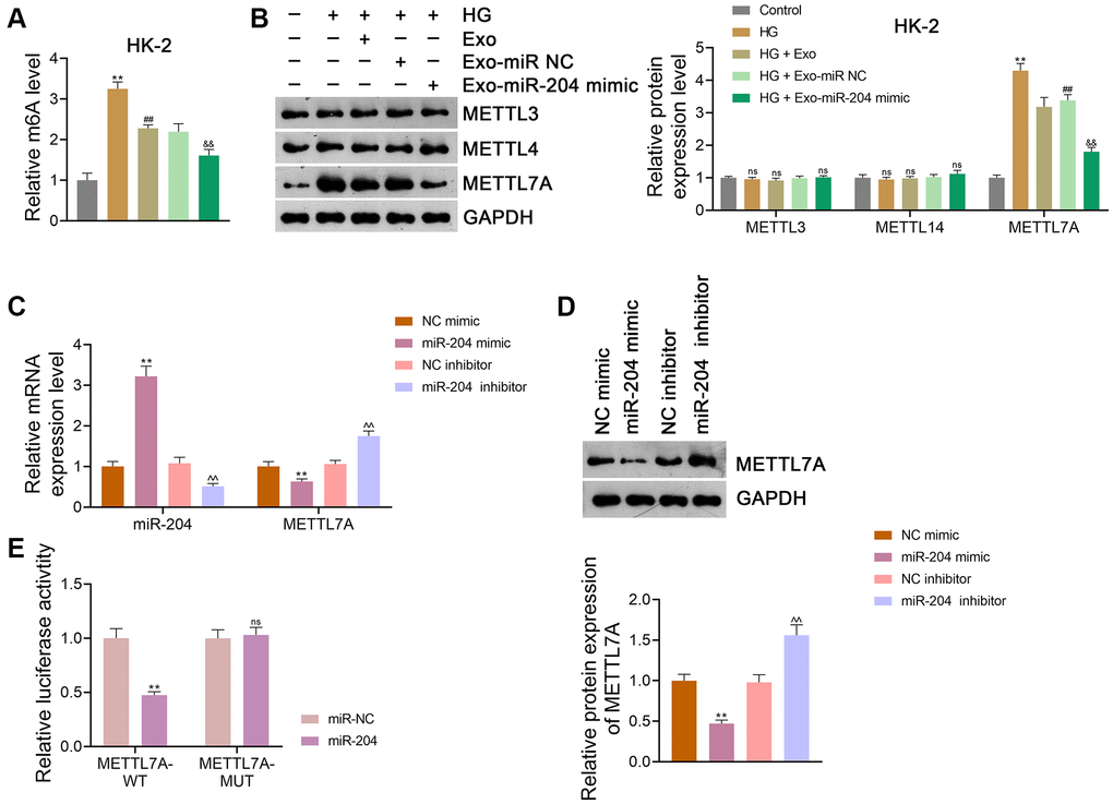 Figure 6. ADSC-derived Exos modified by miR-204 inhibits METTL7A-medicated m6A methylation in HG-induced HK-2 cells. (A) m6A methylation level in HK-2 cells. (B) The expression of METTL3, METTL14, and METTL7A in HK-2 cells using western blotting. (A, B) HK-2 cells were exposed to HG (30 mM) and cultured for 24 h to induce an in vitro model of DN. To figure out the impact of exosomal miR-204 in m6A methylation in DN, ADSCs were transfected with miR-204 mimic or miR NC (negative control) for 48 h. Next, Exos were isolated from the transfected ADSCs and co-cultured with HK-2 a for 12 h at the concentration of 100 μg/mL. Data were expressed as mean ± standard deviation. **p < 0.01 vs. Control group; ##p < 0.01 vs. HG group; &&p < 0.01 vs. HG + Exo-miR NC group; ns indicates no significant differences between groups. (C, D) The expression of miR-204 and METTL7A in HEK293T cells using qRT-PCR and western blotting. (C, D) Data were expressed as mean ± standard deviation. **p < 0.01 vs. mimic NC group; ^^p < 0.01 vs. inhibitor NC group. (E) Determination of the interaction between miR-204 and METTL7A in HEK293T cells using dual-luciferase reporter assay. Data were expressed as mean ± standard deviation. **p < 0.01 vs. miR NC group; ns indicates no significant differences between groups. Abbreviations: ADSC: adipose-derived stem cell; Exos: exosomes; miR-204: microRNA-204; METTL: methyltransferase-like; m6A: N6-methyladenosine; HG: high glucose; qRT-PCR: quantitative real-time polymerase chain reaction.