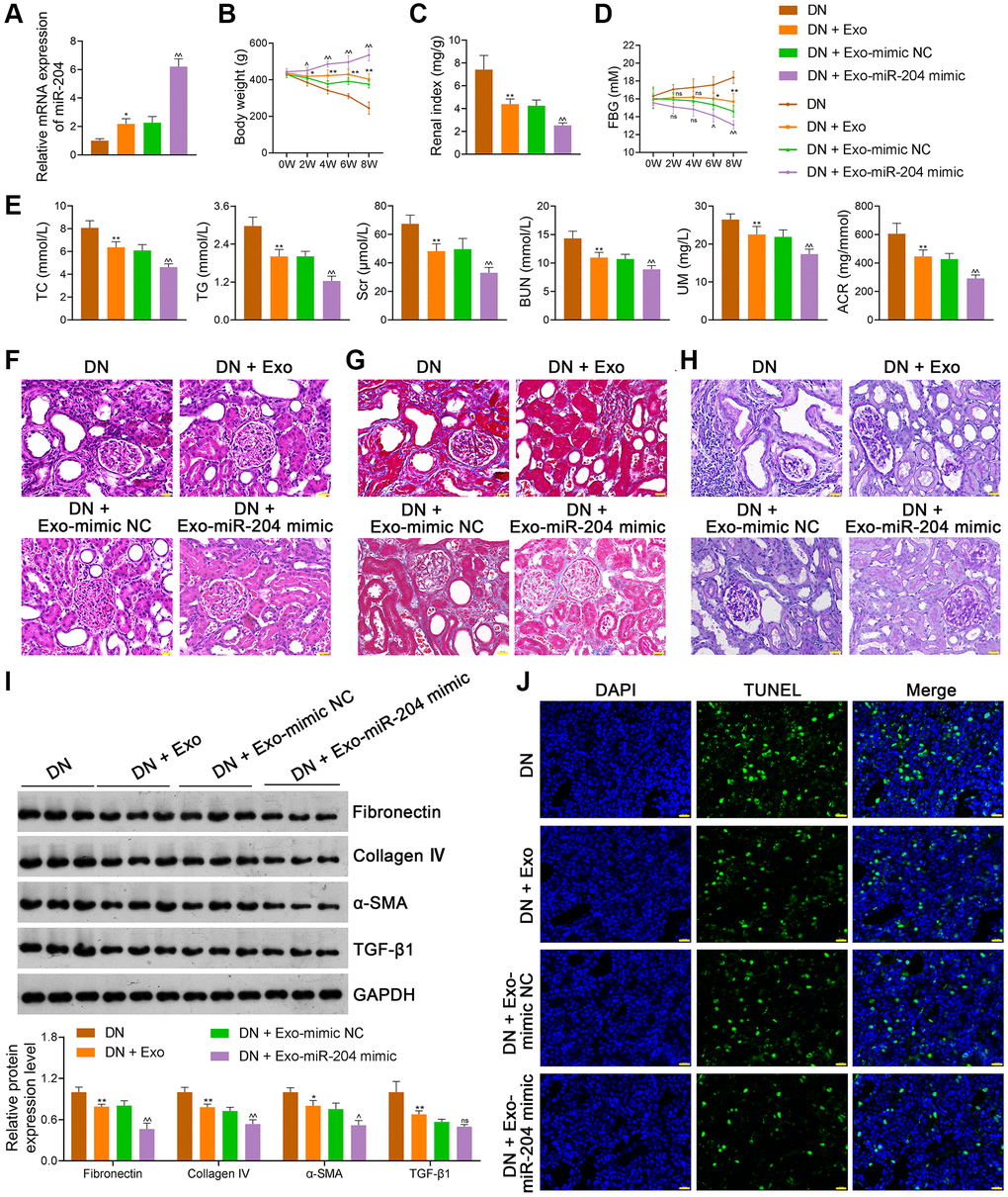 Figure 9. ADSC-derived Exos loaded with miR-204 ameliorate the symptoms of DN rats. (A) The expression of miR-204 of rats in each group using qRT-PCR. (B–D) The body weights, renal index, and FBG levels of rats in each group. (E) Plasma TC, TG, Scr, BUN, UM, and ACR of rats in each group using an enzymatic colorimetric assay and ELISA. (F–H) Histopathological examinations in the kidney tissues of rats in each group using HE, Masson, and PAS staining (scale bar = 20 μm). (I) The expression of fibronectin, collagen IV, α-SMA, and TGF-β1 in the kidney tissues of rats in each group using western blotting. (J) Cell apoptosis in the kidney tissues of rats in each group using a TUNEL assay (scale bar = 20 μm). Rats in the Exo group were treated with 1.6 mg/kg ADSC-derived Exos via caudal vein injection every two days for eight successive weeks. At the same time, rats in the DN + Exo-mimic NC and DN + Exo-miR-204 mimic groups were treated with ADSC-derived Exos loaded with mimic-NC (negative control) or miR-204 mimic, respectively. Rats in the DN group were injected with the same volume of saline. Data were expressed as mean ± standard deviation (n = 6/group). *p < 0.05 and **p < 0.01 vs. DN group; ^p < 0.05 and ^^p < 0.01 vs DN + Exo-mimic NC group; ns indicates no significant differences between groups. Abbreviations: ADSC: adipose-derived stem cell; Exos: exosomes; miR-204: microRNA-204; DN: diabetic nephropathy; qRT-PCR: quantitative real-time polymerase chain reaction; FBG: fasting blood-glucose; TC: total cholesterol, TG: triglyceride; BUN: blood urea nitrogen; Scr: serum creatinine; UM: urinary microalbumin; ACR: albumin to creatinine ratio; ELISA: enzyme-linked immunosorbent assay; HE: hematoxylin-eosin; PAS: periodic acid-Schiff; α-SMA: alpha-smooth muscle actin; TGF-β1: transforming growth factor beta 1; TUNEL: terminal deoxynucleotidyl transferase-mediated dUTP nick-end labeling.