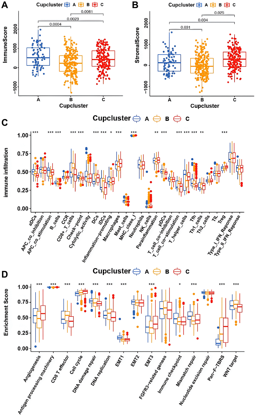 Figure 3. Potential characteristics in distinct cuproptosis-related phenotypes. (A) Differences in immune score among three cuproptosis regulation patterns in merge cohort (P < 0.05, Kruskal-Wallis test). (B) Differences in stromal score among three cuproptosis regulation patterns in merge cohort (P < 0.05, Kruskal-Wallis test). (C) The fraction of TME infiltrating cell in distinct cuproptosis regulation patterns using the CIBERSORT algorithm. The bottom and top of the boxes were interquartile range of values. The thick line in the boxes indicated median value. Significant results are indicated as *p < 0.05, **p < 0.01, and ***p < 0.001. (D) Differences of stroma-activated pathways in three cuproptosis regulation patterns. Significant results are indicated as *p < 0.05, **p < 0.01, and ***p < 0.001.
