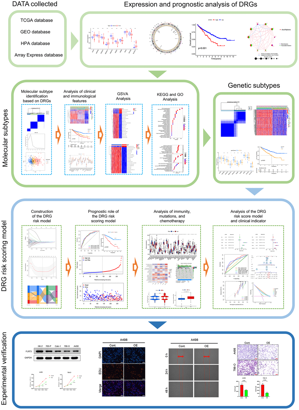Methods: The expression, transcriptional variants, and prognostic role of DRGs were assessed. Based on DRGs, consensus unsupervised clustering analysis was performed to stratify ccRCC patients into various subtypes and constructed a DRG risk scoring model. Patients were stratified into high or low-risk groups by this model. We focused on assessing the discrepancy in prognosis, TME, chemotherapeutic susceptibility, and landscape of immune between the two risk groups. Finally, we validated the expression and explored the biological function of the risk scoring gene FLRT3 through in vitro experiments.
