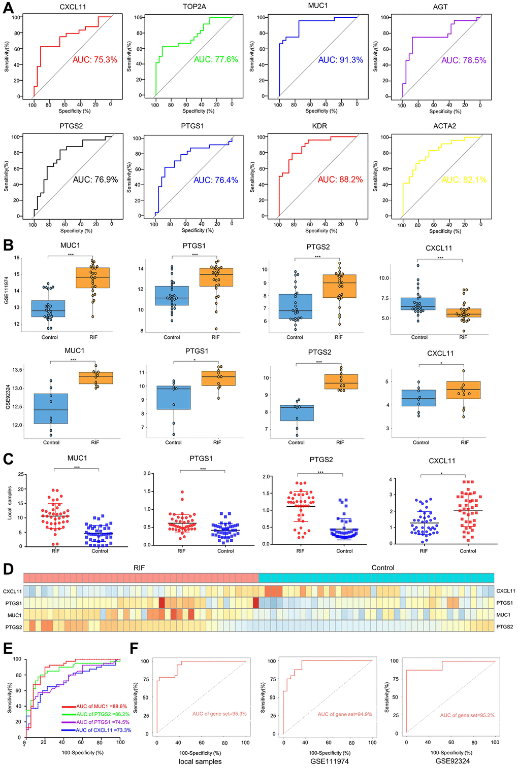 The hub gene and the matrix of infiltrating immune cells showed that MUC1, CXCL11, PTGS1 and PTGS2 were associated with different immune cells. The GSEA results of MUC1, CXCL11, PTGS1 and PTGS2 genes showed that the pathway involved in each hub gene was not the same, which further indicated that each hub gene had its own value and could not be replaced by another hub gene. GSE111974 dataset was used for ROC analysis, and it was found that the expressions of MUC1, PTGS2, PTGS1 and CXCL11 had good diagnostic value, and AUC was higher than 0.75. After validation of the GESE92324 dataset and local samples, MUC1, CXCL11, PTGS1 and PTGS2 were labeled as potential biomarkers for the diagnosis of RIF, and the four-gene signature (MUC1-CXCL11-pTGs1-PTGS2) showed perfect discrimination ability with AUC of up to 95%.